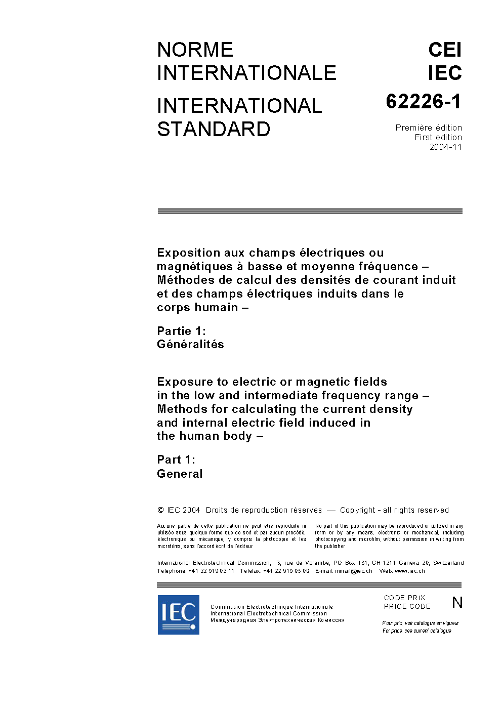 IEC 62226-1:2004 Exposure to electric or magnetic fields in the low and intermediate frequency range - Methods for calculating the current density and internal electric field induced in the human body - Part 1: General