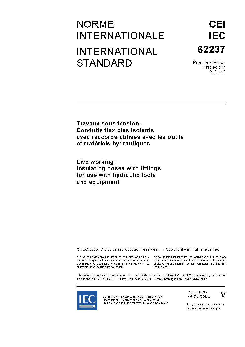 IEC 62237:2003 Live working - Insulating hoses with fittings for use with hydraulic tools and equipment