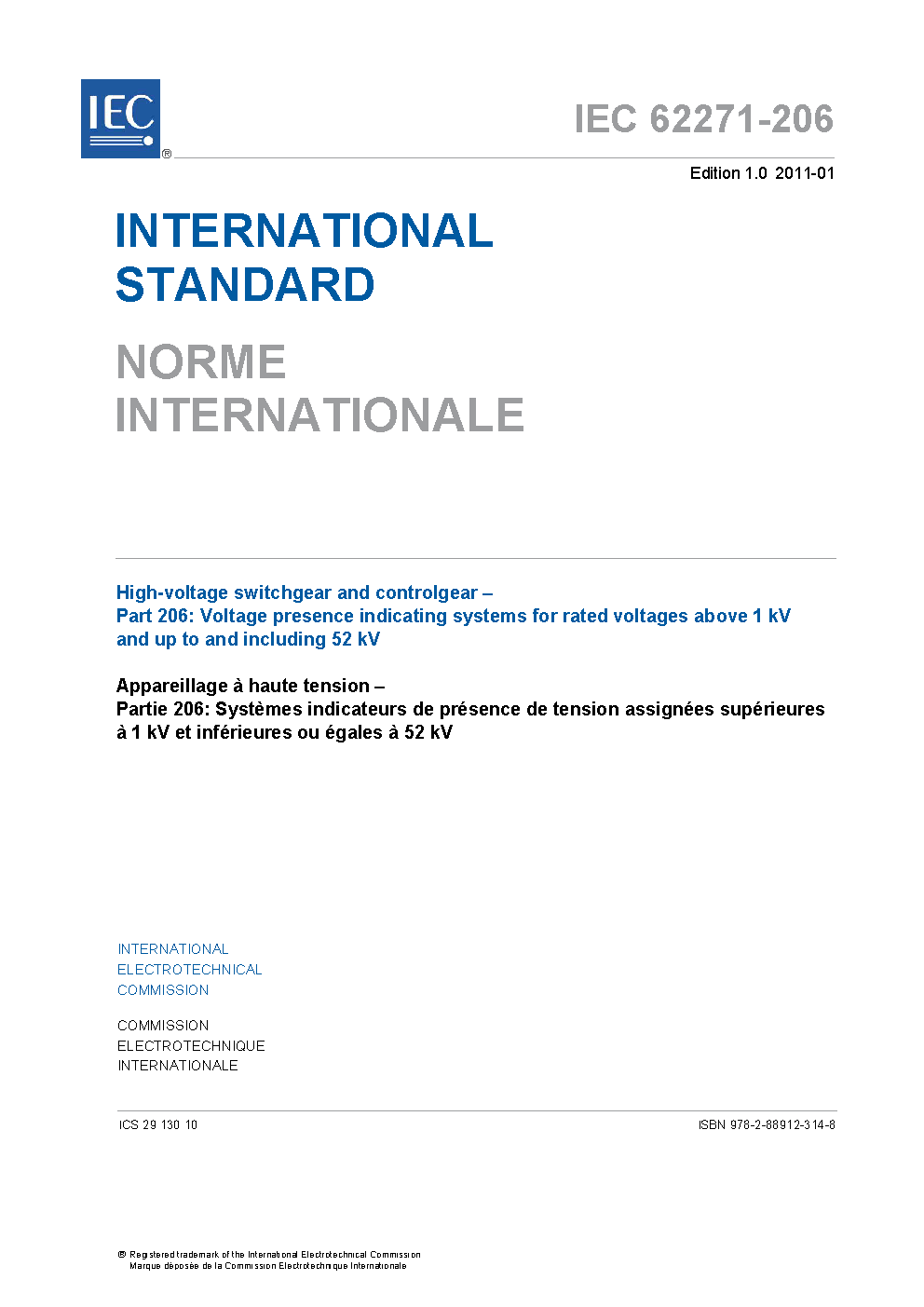 IEC 62271-206:2011 High-voltage switchgear and controlgear - Part 206: Voltage presence indicating systems for rated voltages above 1 kV and up to and including 52 kV