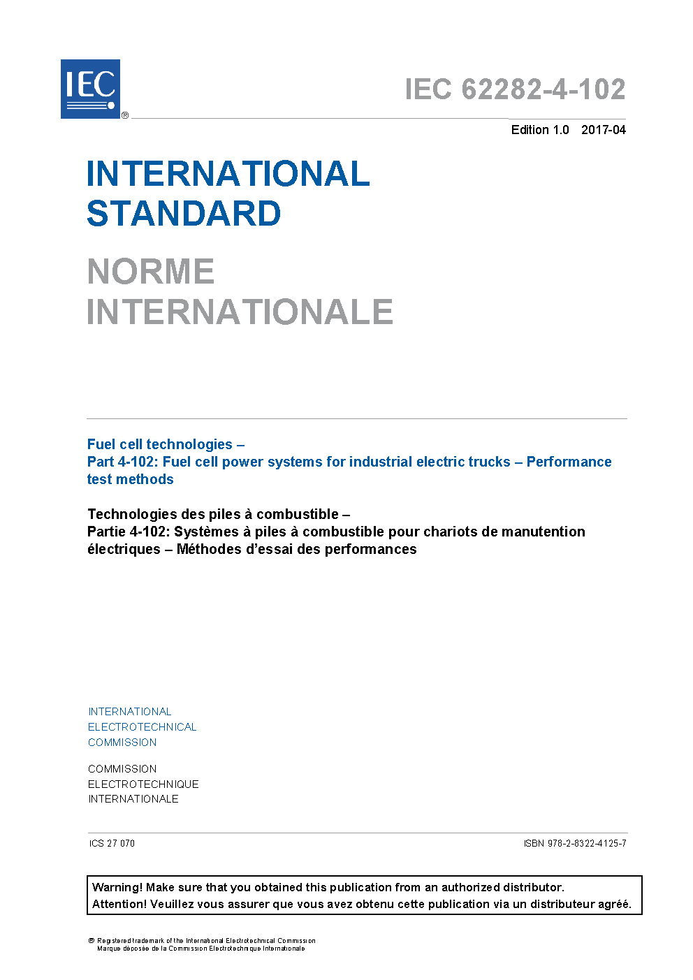 IEC 62282-4-102:2017 Fuel cell technologies - Part 4-102: Fuel cell power systems for industrial electric trucks - Performance test methods