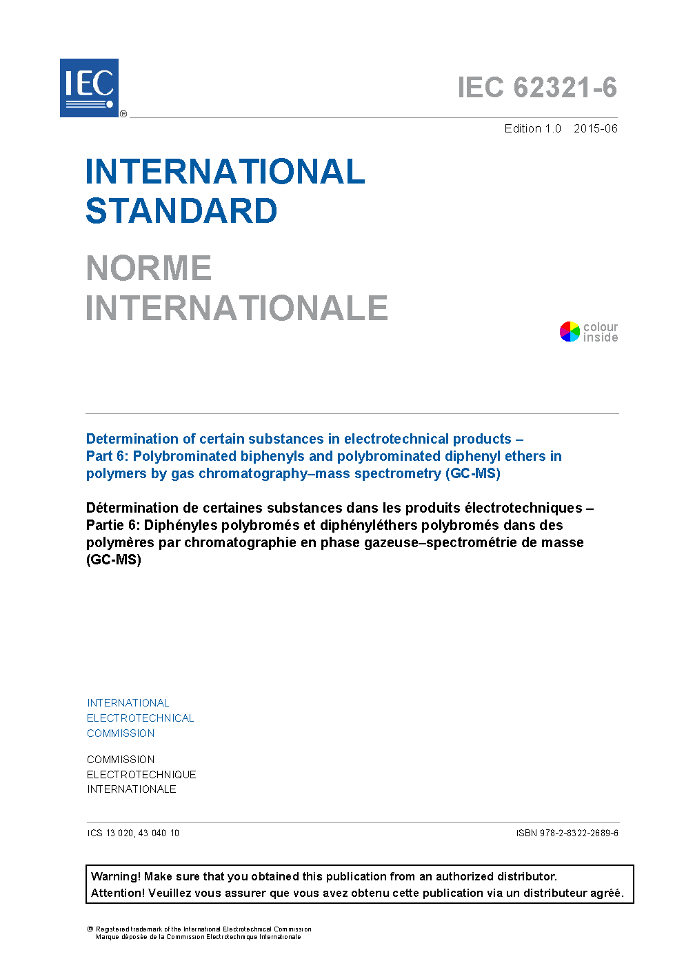 IEC 62321-6:2015 Determination of certain substances in electrotechnical products - Part 6: Polybrominated biphenyls and polybrominated diphenyl ethers in polymers by gas chromatograhy -mass spectometry (GC-MS)