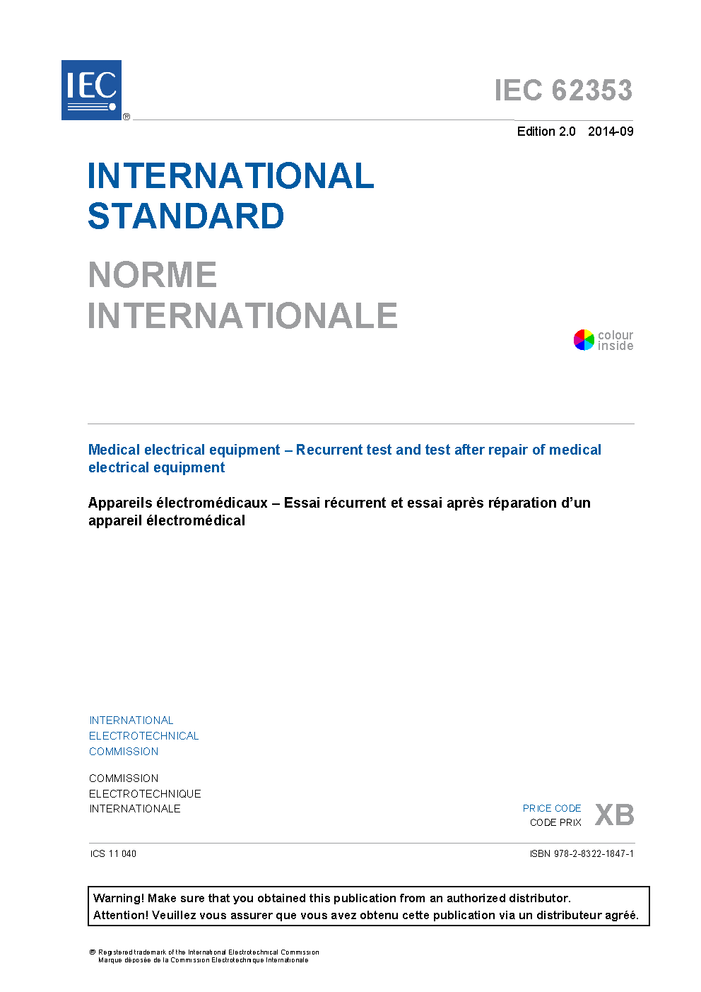 IEC 62353:2014 Medical electrical equipment - Recurrent test and test after repair of medical electrical equipment