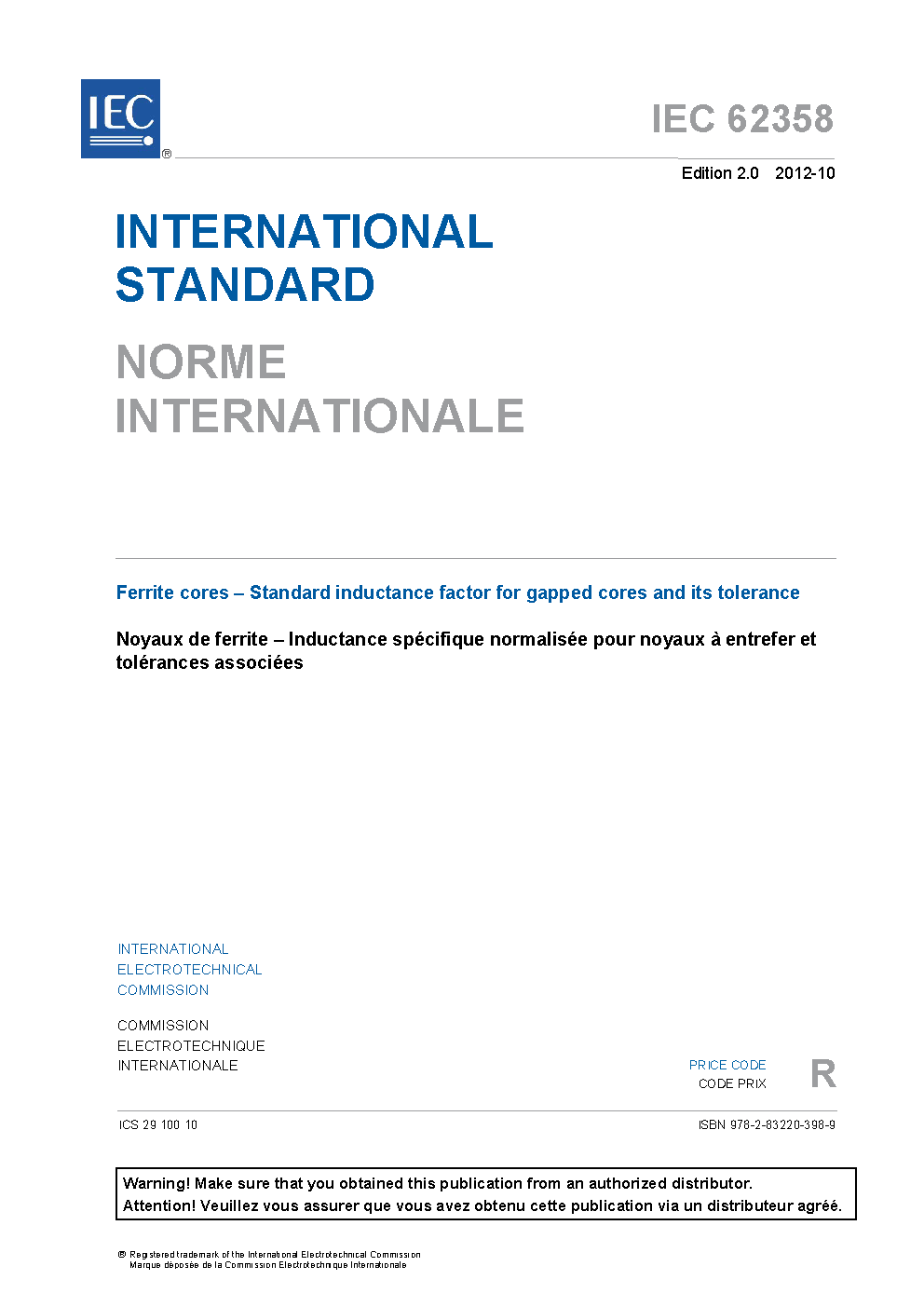 IEC 62358:2012 provides standard AL values (inductance factors) and their tolerances of Pot, RM, ETD, E, EER, EP, PQ and low-profile gapped ferrite cores. This edition includes the following significant technical changes with respect to the previous editions: