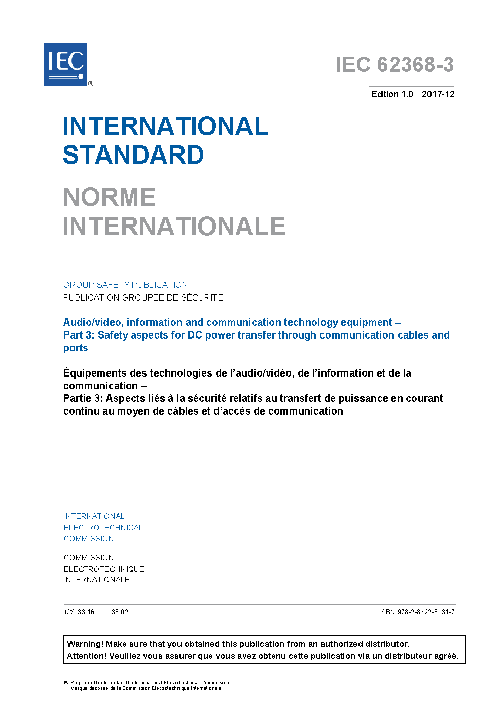IEC 62368-3:2017 Audio/video, information and communication technology equipment - Part 3: Safety aspects for DC power transfer through communication cables and ports