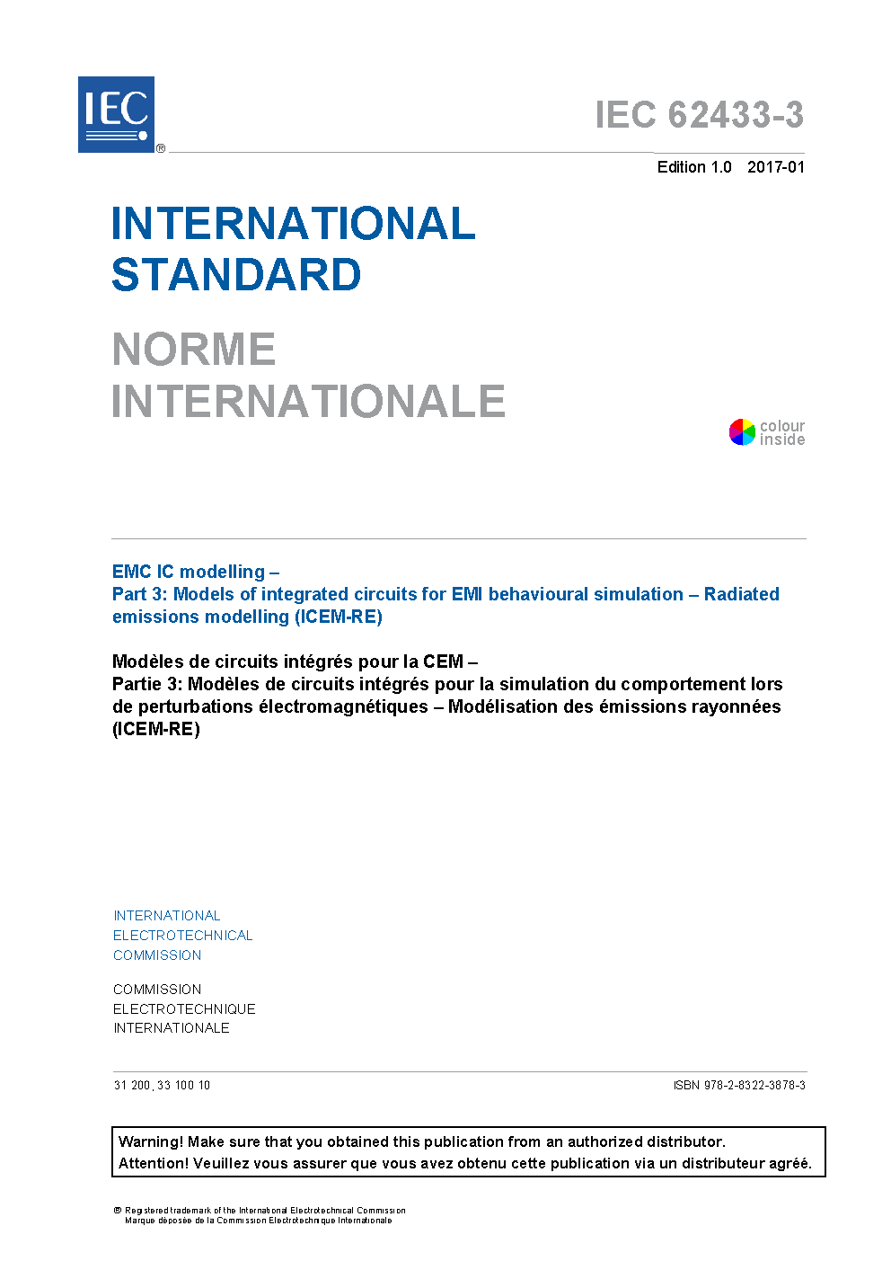IEC 62433-3:2017 provides a method for deriving a macro-model to allow the simulation of the radiated emission levels of an Integrated Circuit (IC). This model is commonly called Integrated Circuit Emission Model - Radiated Emission, ICEM-RE. The model is intended to be used for modelling a complete IC, with or without its associated package, a functional block and an Intellectual Property (IP) block of both analogue and digital ICs (input/output pins, digital core and supply), when measured or simulated data cannot be directly imported into simulation tools.