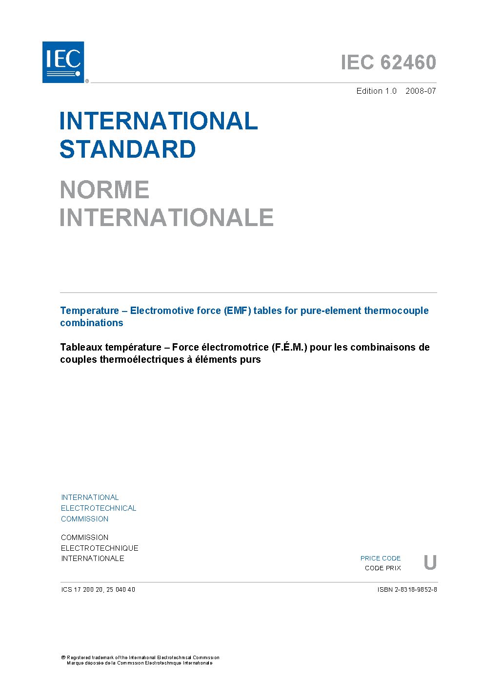 IEC 62460:2008 Temperature - Electromotive force (EMF) tables for pure-element thermocouple combinations