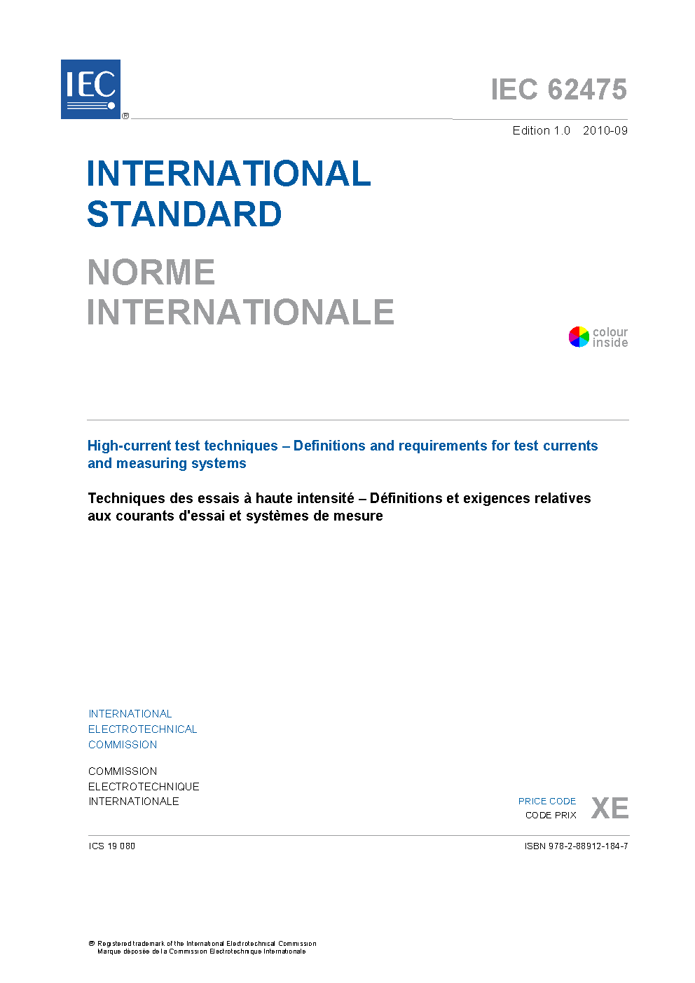 IEC 62475:2010 is applicable to high-current testing and measurements on both high-voltage and low-voltage equipment. It deals with steady-state and short-time direct current (as e.g. encountered in high-power d.c. testing), steady-state and short-time alternating current (as e.g. encountered in high-power a.c. testing), and impulse-current. In general, currents above 100 A are considered in this International Standard, although currents less than this can occur in tests. This standard also covers fault detection during, for example, lightning impulse testing.
