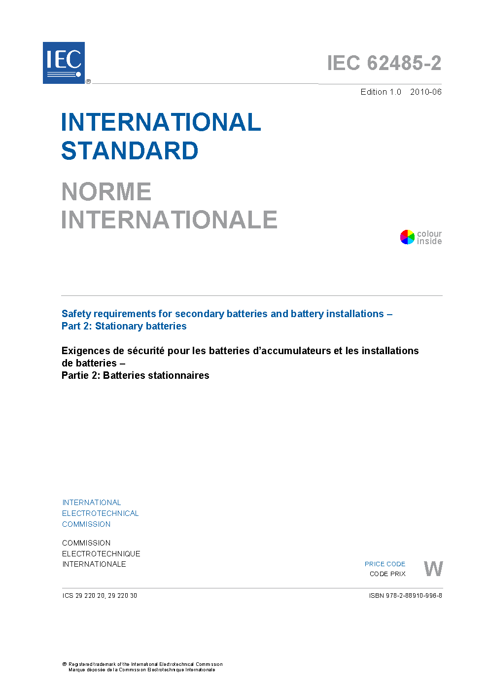 IEC 62485-2:2010 applies to stationary secondary batteries and battery installations with a maximum voltage of DC 1 500 V (nominal) and describes the principal measures for protections against hazards generated from: