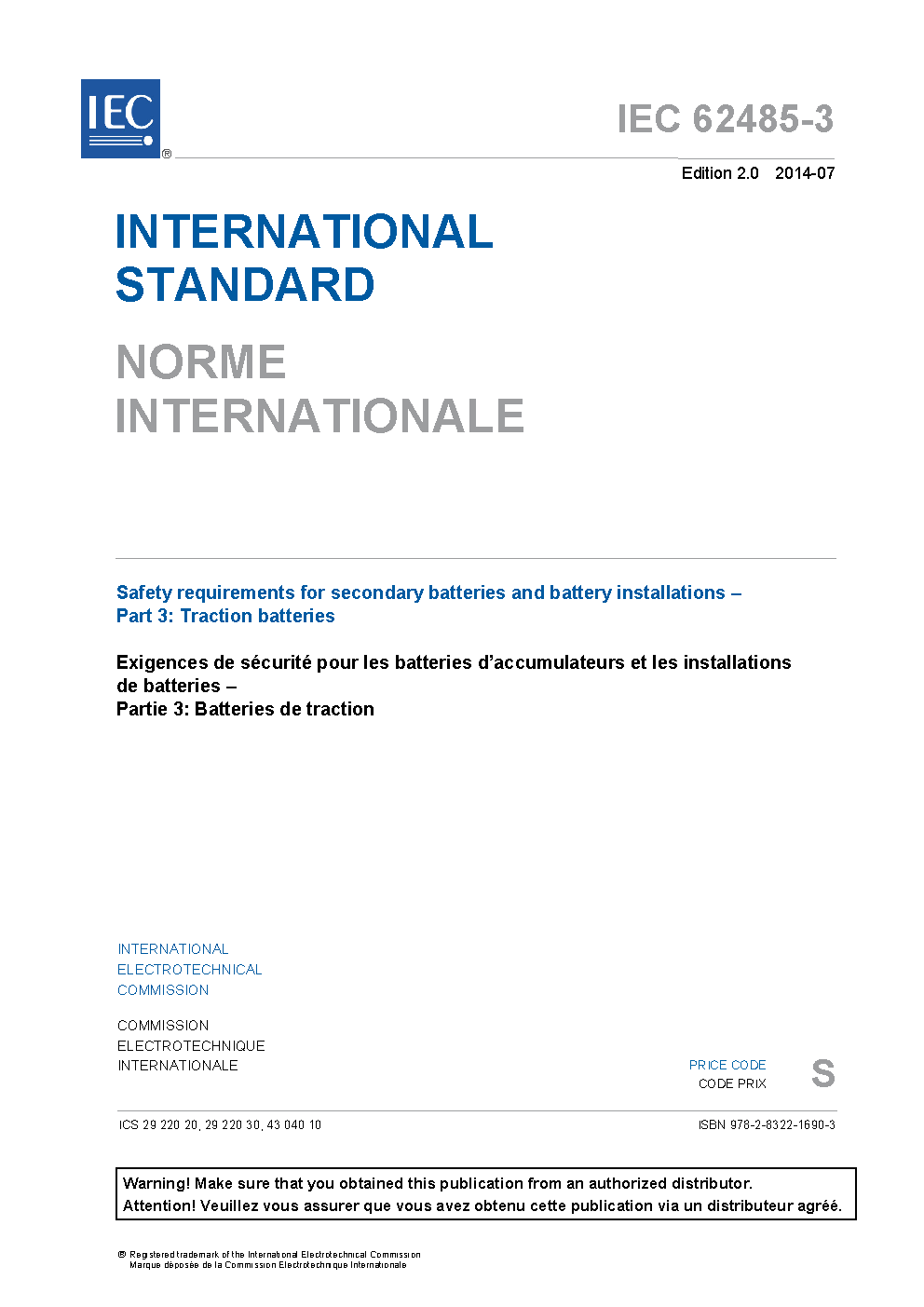 IEC 62485-3:2014 Safety requirements for secondary batteries and battery installations - Part 3: Traction batteries
