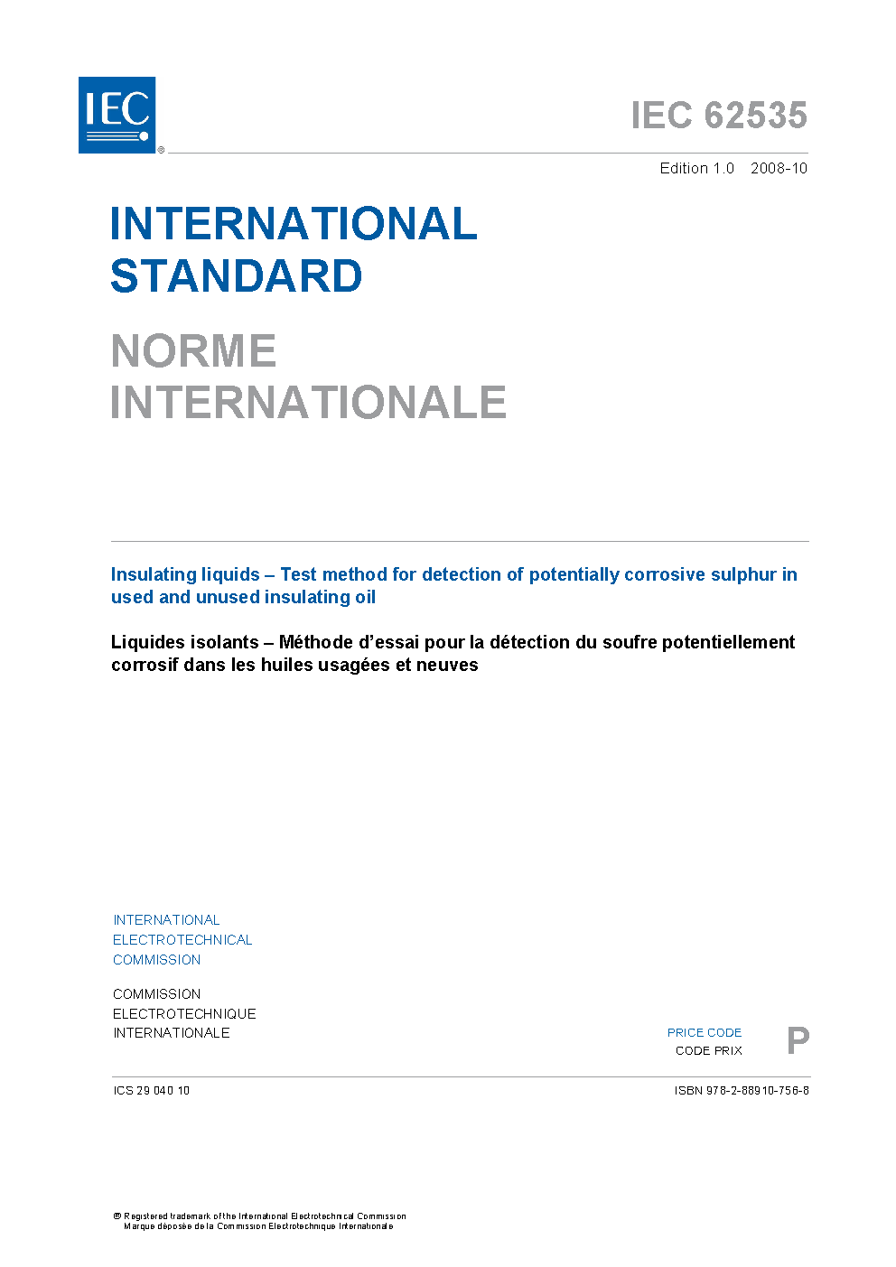 IEC 62535:2008 Insulating liquids - Test method for detection of potentially corrosive sulphur in used and unused insulating oil