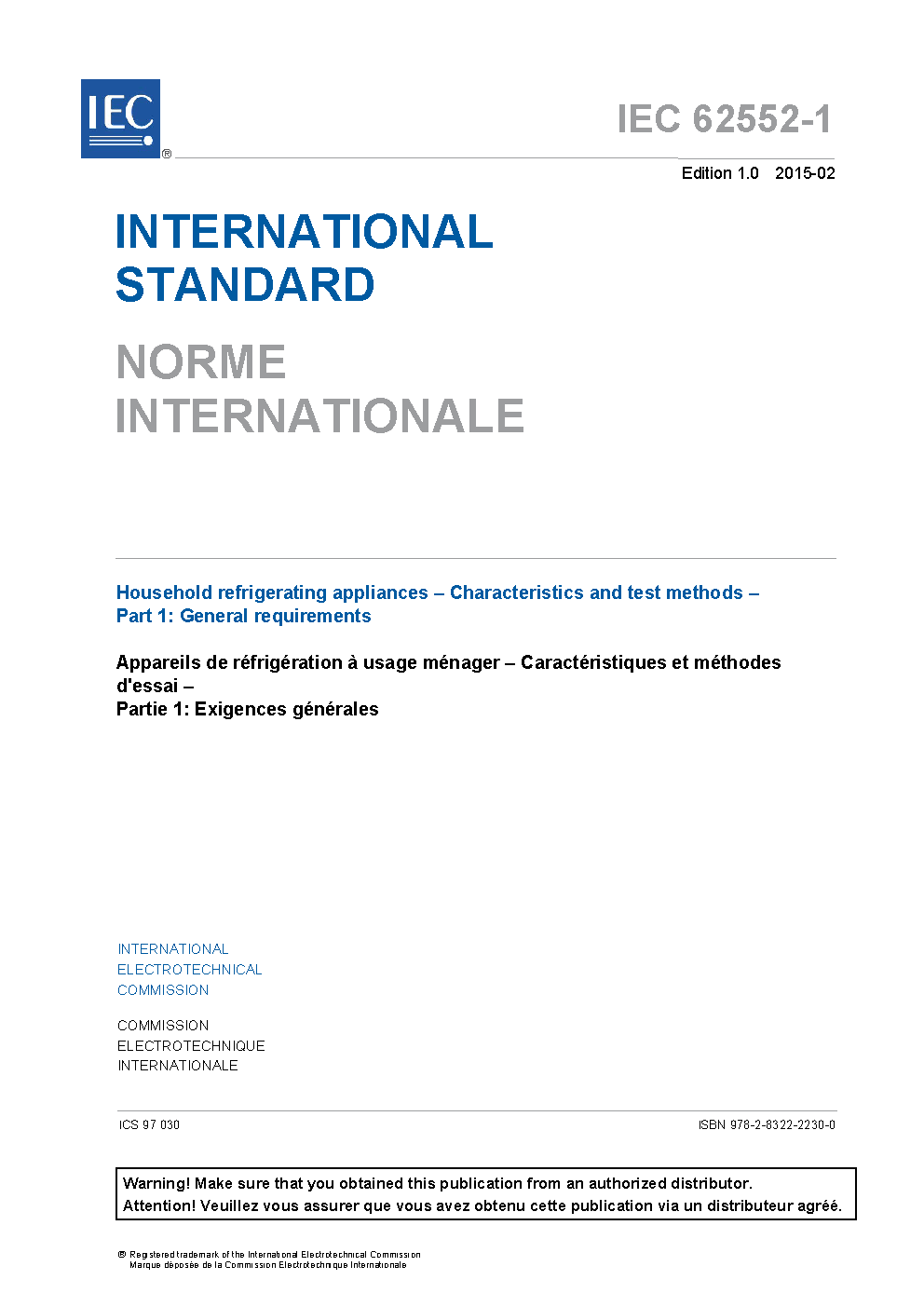 IEC 62552-1:2015 Household refrigerating appliances - Characteristics and test methods - Part 1: General requirements