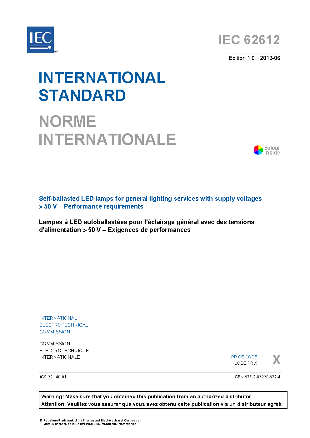 IEC 62612:2013 Self-ballasted LED lamps for general lighting services with supply voltages > 50 V - Performance requirements