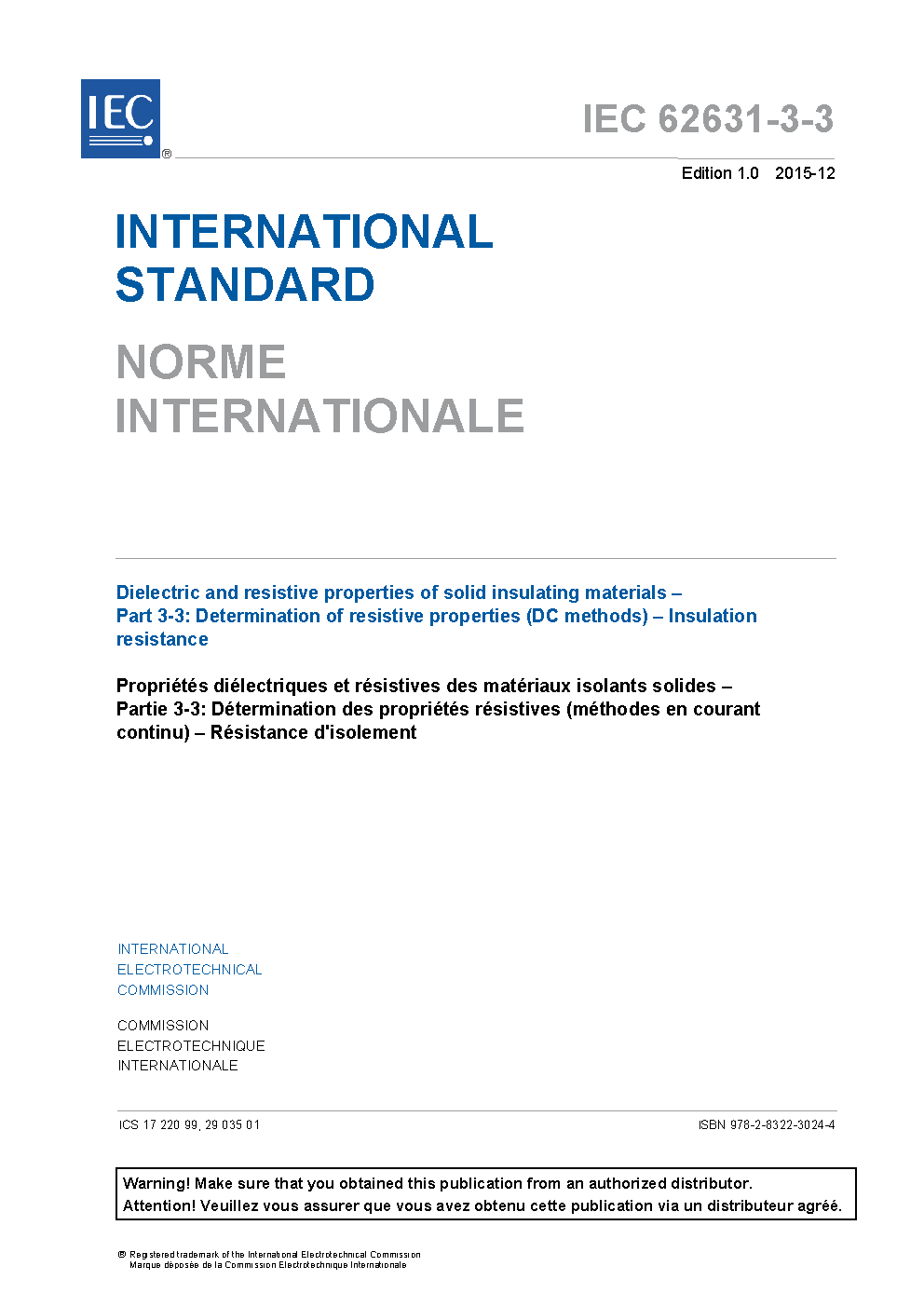 IEC 62631-3-3:2015 Dielectric and resistive properties of solid insulating materials - Part 3-3: Determination of resistive properties (DC methods) - Insulation resistance