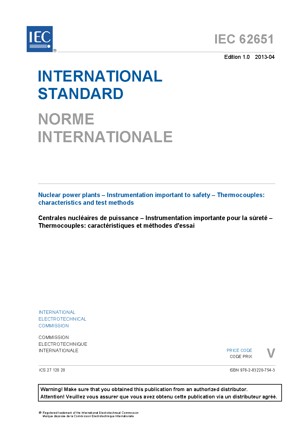 IEC 62651:2013 describes the requirements for thermocouples suitable for nuclear power plant (NPP) applications. Thermocouples are widely used in NPPs with other temperature measurement devices such as resistance temperature detectors. They are simple and robust and have some specific characteristics (range of measurement and maximum temperature) which make them uniquely suitable for some measurements. The requirements given in this standard for thermocouples include design, materials, manufacturing, testing, calibration, procurement, and inspection.