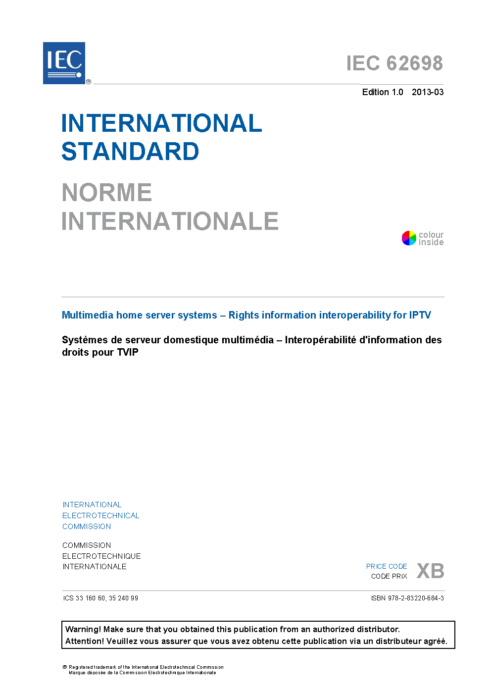 IEC 62698:2013 Multimedia home server systems - Rights information interoperability for IPTV