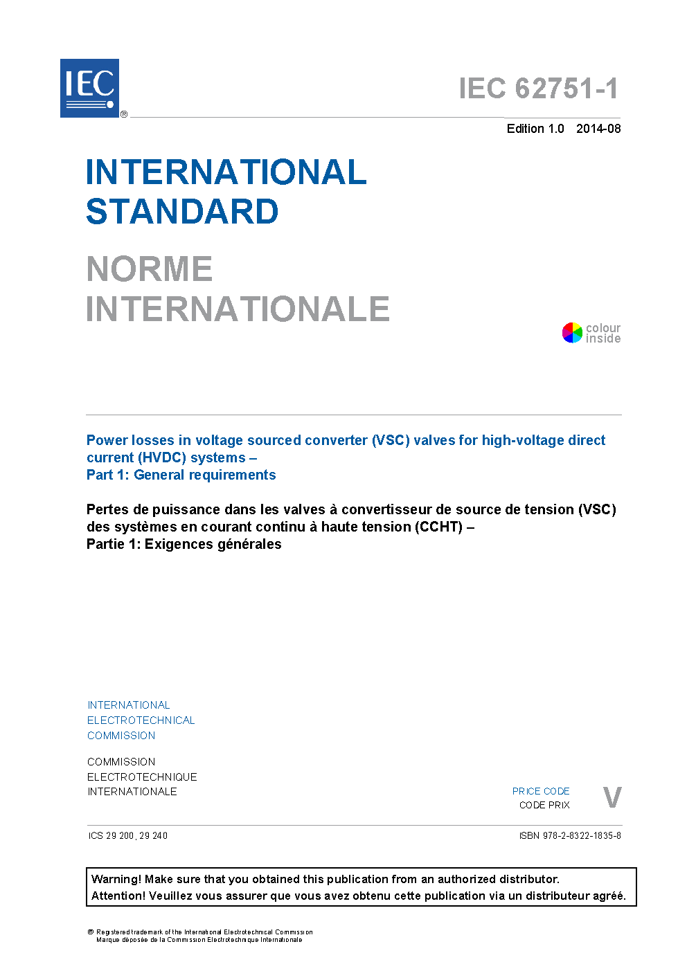 IEC 62751-1:2014 Power losses in voltage sourced converter (VSC) valves for high-voltage direct current (HVDC) systems - Part 1: General requirements
