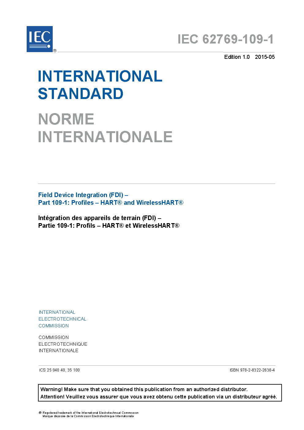 IEC 62769-109-1:2015 specifies an FDI profile of IEC 62769 for IEC 61784-1_CP 9/1 (HART®) and IEC 61784-1_CP 9/2 (WirelessHART®).