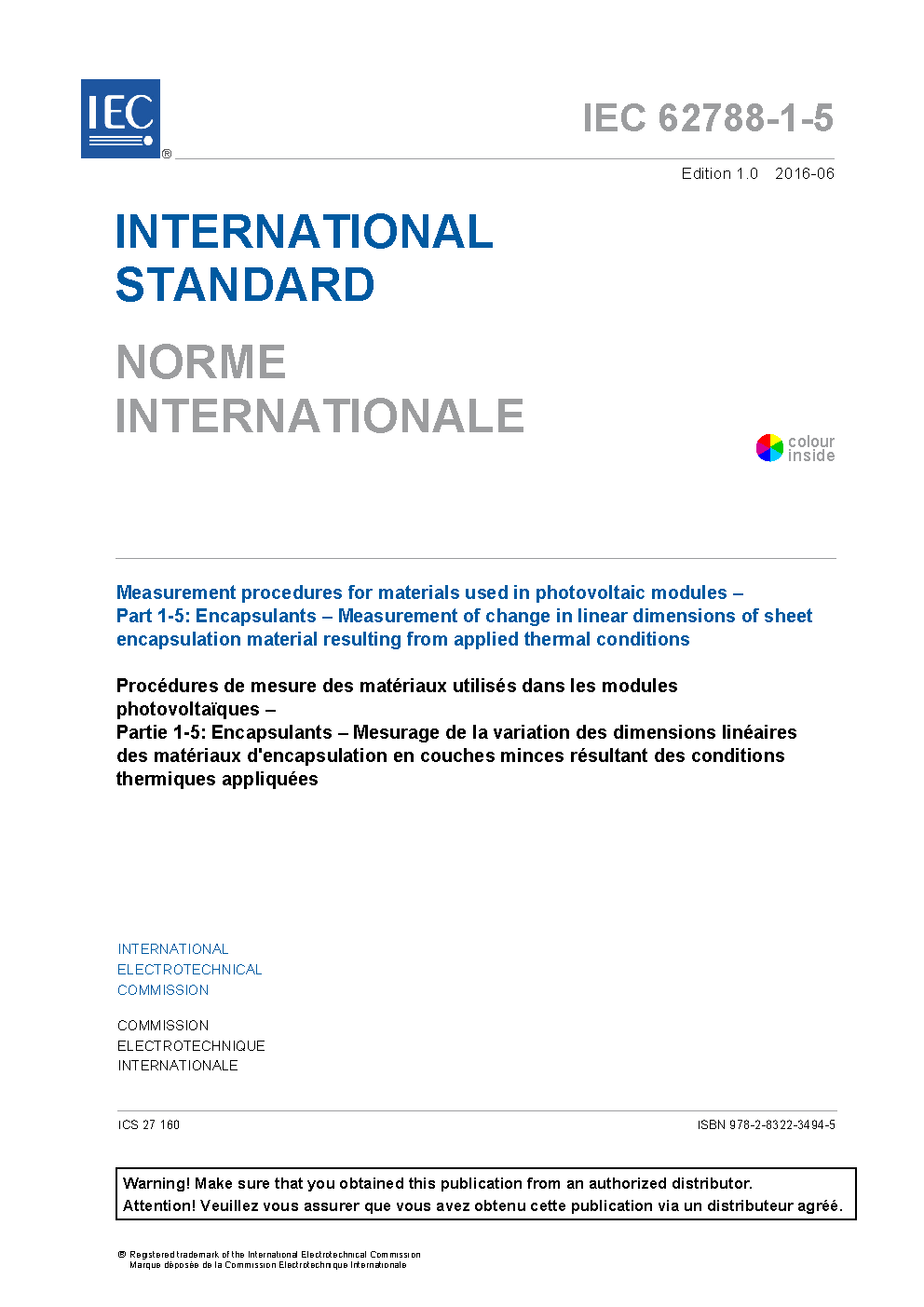 IEC 62788-1-5:2016 Measurement procedures for materials used in photovoltaic modules - Part 1-5: Encapsulants - Measurement of change in linear dimensions of sheet encapsulation material resulting from applied thermal conditions