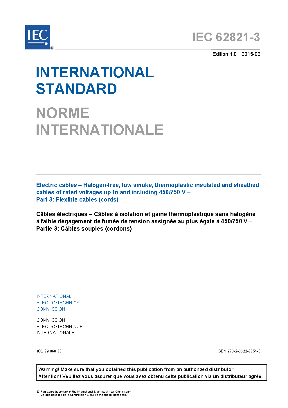 IEC 62821-3:2015 applies to flexible cables for connection to appliances, insulated and sheathed with halogen-free thermoplastic compound and having low emission of smoke and corrosive gases when exposed to fire. The cables are of rated voltages up to and including 300/500 V. Circular cables and flat cables are included.