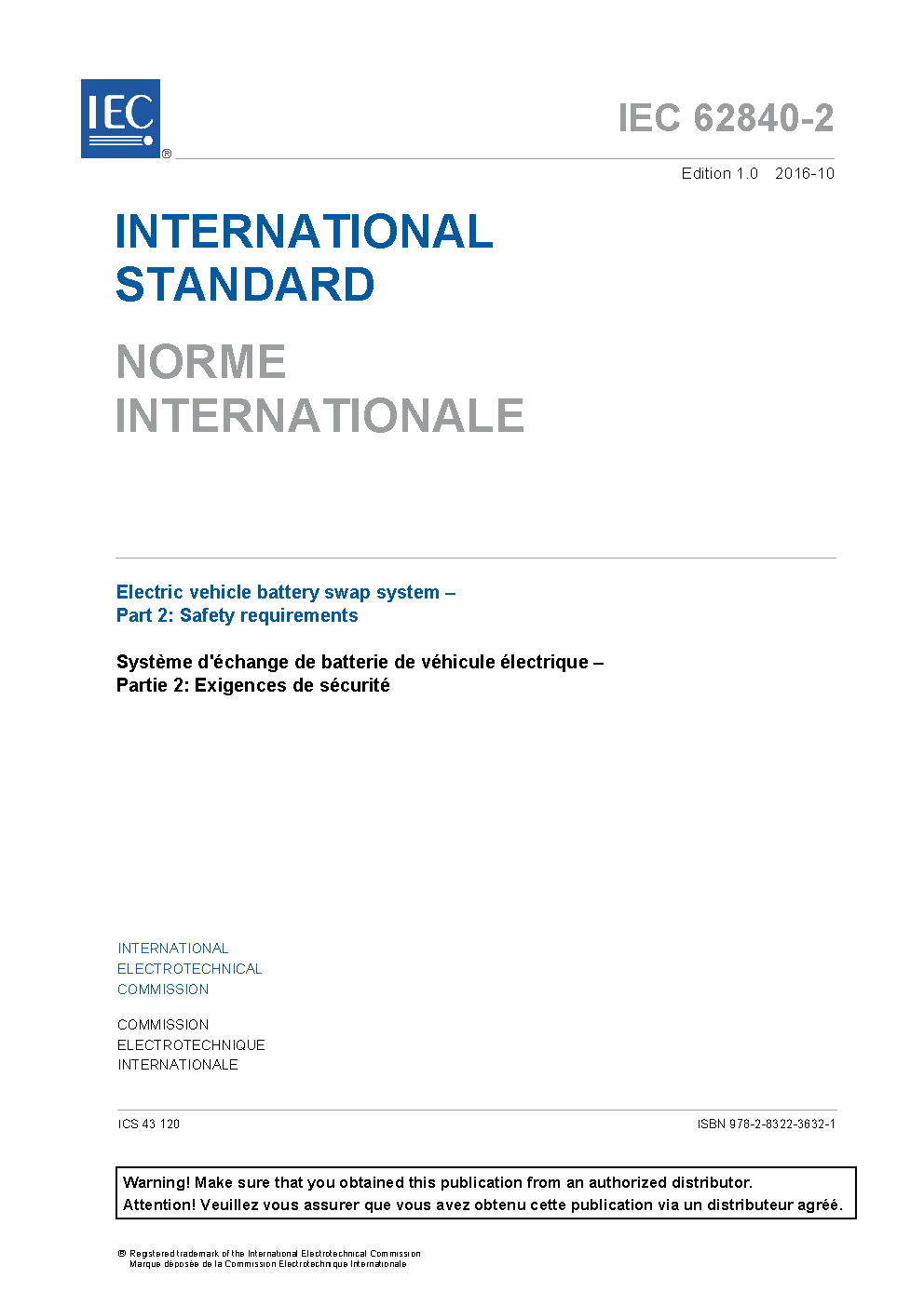 IEC 62840-2:2025 provides the safety requirements for a battery swap system, for the purposes of swapping swappable battery system (SBS)/handheld-swappable battery system (HBS) of electric vehicles. The battery swap system is intended to be connected to the supply network. The power supply is up to 1 000 V AC or up to 1 500 V DC in accordance with IEC 60038. This document also applies to battery swap systems supplied from on-site storage systems (e.g. buffer batteries).