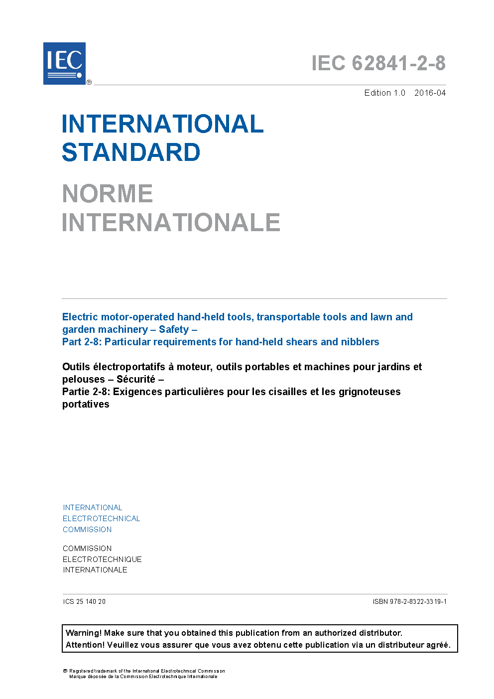 IEC 62841-2-8:2016 Electric motor-operated hand-held tools, transportable tools and lawn and garden machinery - Safety - Part 2-8: Particular requirements for hand-held shears and nibblers