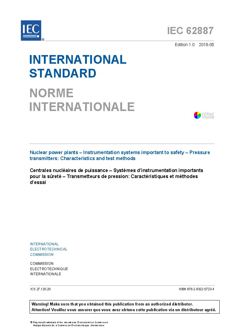 IEC 62887:2018 lays down specific requirements for nuclear applications of pressure transmitters including design, materials, manufacturing, testing, calibration and inspection. This document is applicable to general aspects of design, manufacturing and test methods for pressure transmitters used in instrumentation systems important to safety in all nuclear power plants (PWR, BWR, FBR, etc.). The consequences of nuclear conditions for pressure transmitters lead to onerous requirements regarding qualification.