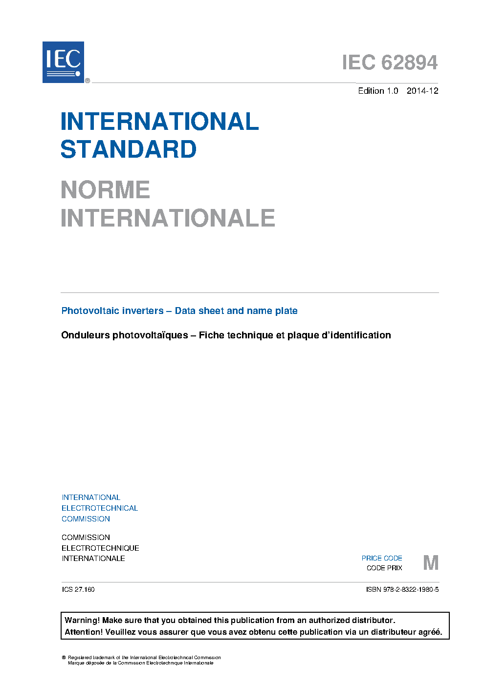 IEC 62894:2014 Onduleurs photovoltaïques - Fiche technique et plaque d'identification