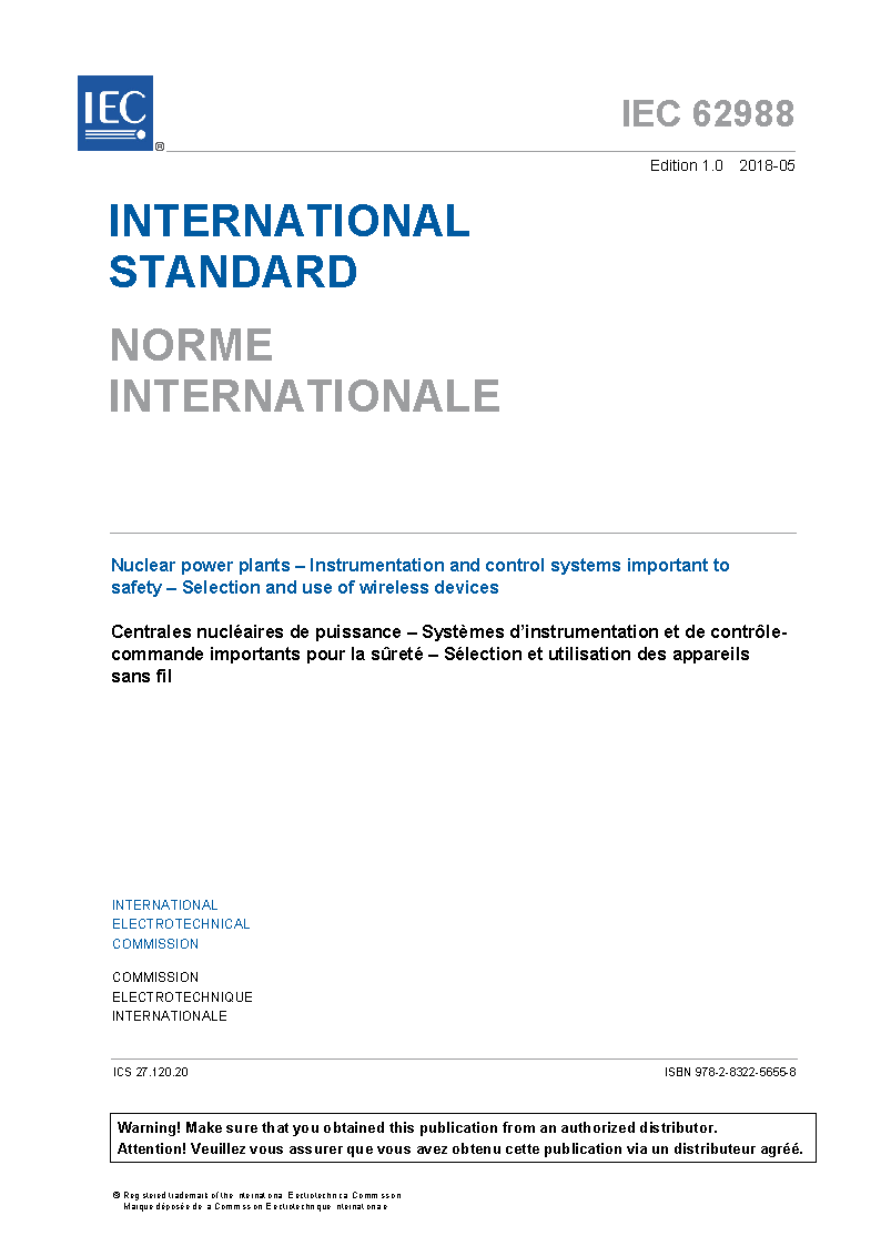 IEC 62988:2018 Nuclear power plants - Instrumentation and control systems important to safety - Selection and use of wireless devices