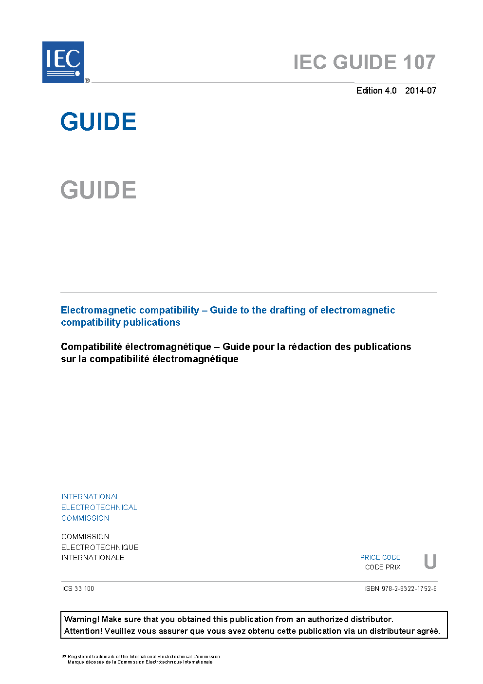 GUIDE 107:2014 describes procedures for the drafting of IEC publications that relate wholly or partly to electromagnetic compatibility (EMC). They are applied when preparing new electromagnetic compatibility publications or EMC clauses, as well as when revising existing publications. These procedures are followed in order to ensure that the resulting publications are consistent with each other and current practice, and to avoid overlapping document scopes.