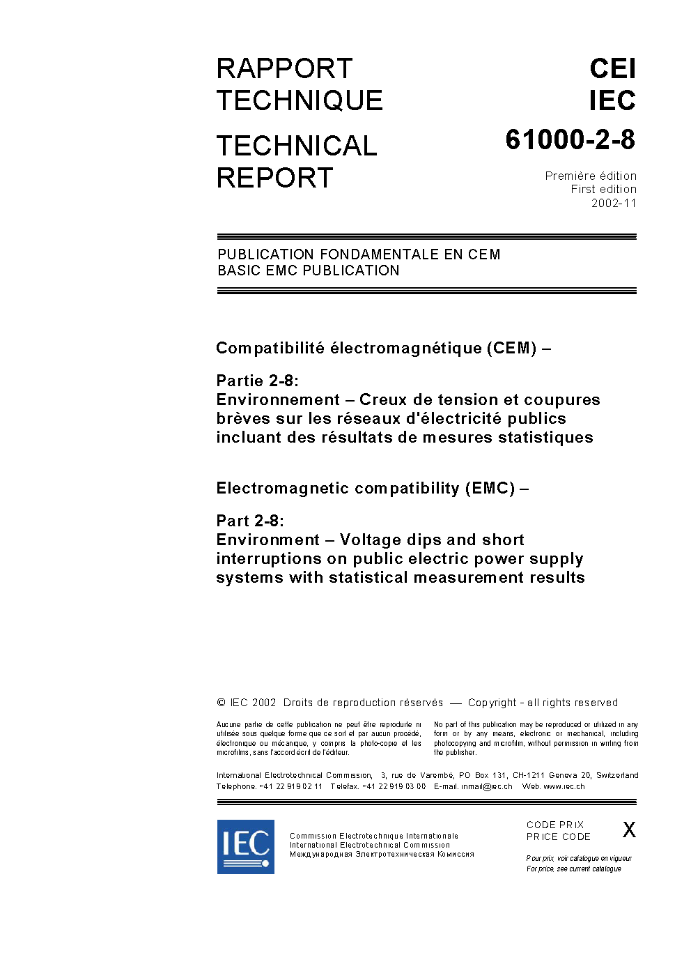 IEC TR 61000-2-8:2002, which is a technical report, describes the electromagnetic disturbance phenomena of voltage dips and short interruptions in terms of their sources, effects, remedial measures, methods of measurement, and measurement results (in so far as these are available). They are discussed primarily as phenomena observed on the networks of public electricity supply systems and having an effect on electrical equipment receiving its energy supply from those systems.