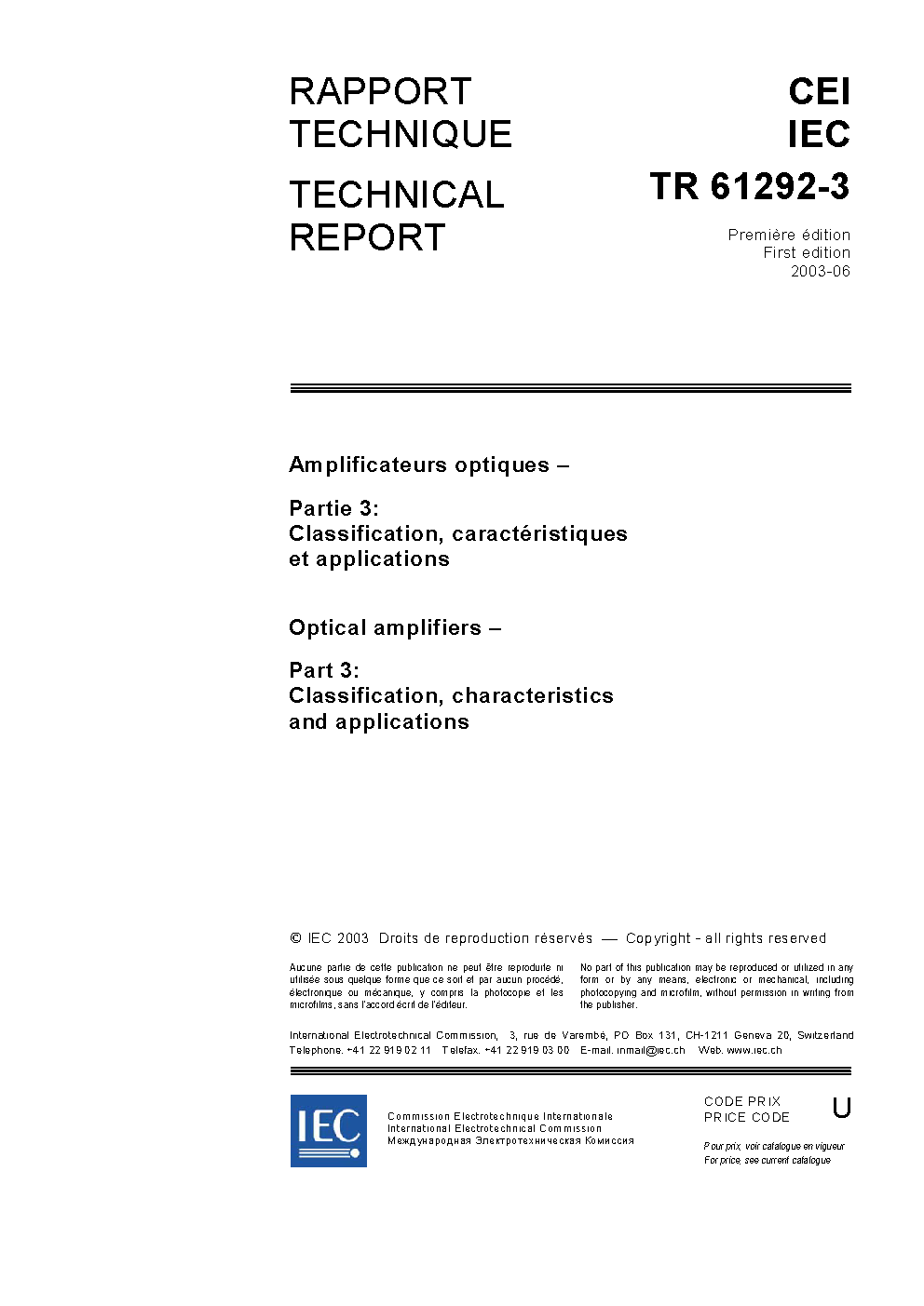 IEC TR 61292-3:2003 Optical amplifiers - Part 3: Classification, characteristics and applications