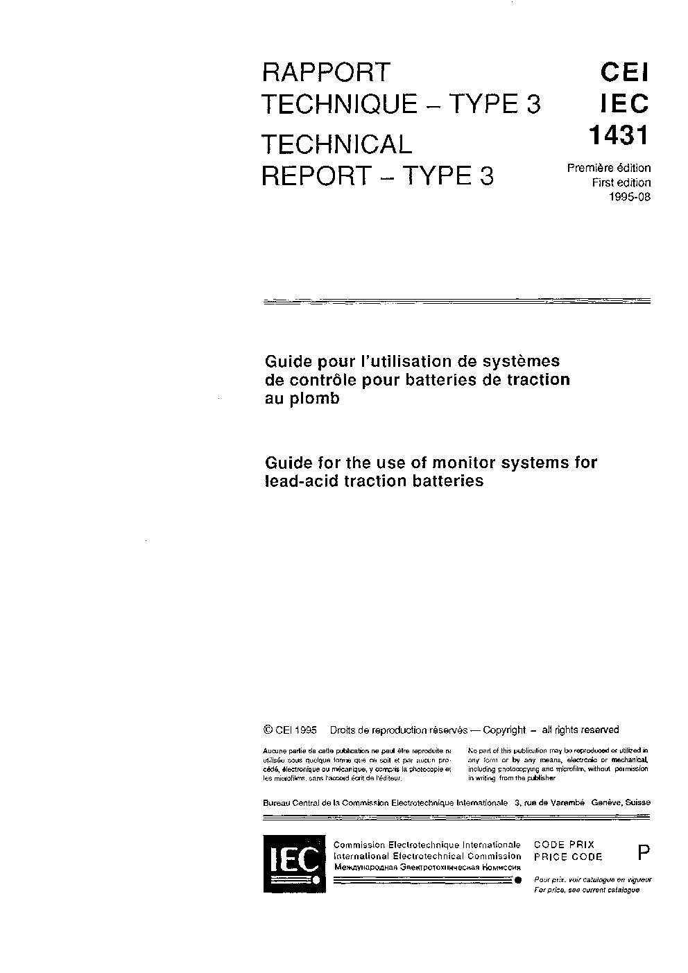 IEC TR 61431:1995 Guide for the use of monitor systems for lead-acid traction batteries