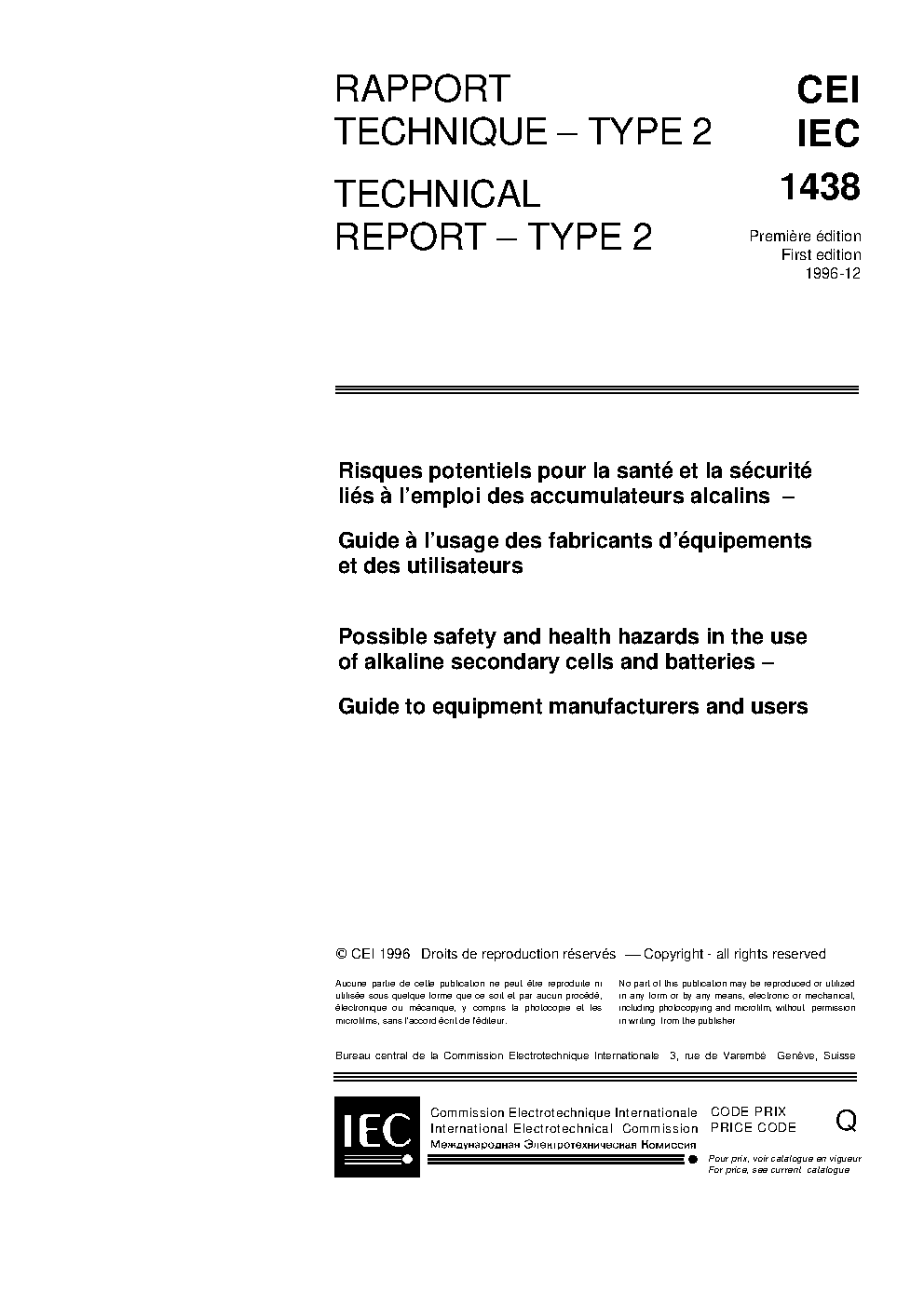 IEC TR 61438:1996 Possible safety and health hazards in the use of alkaline secondary cells and batteries - Guide to equipment manufacturers and users