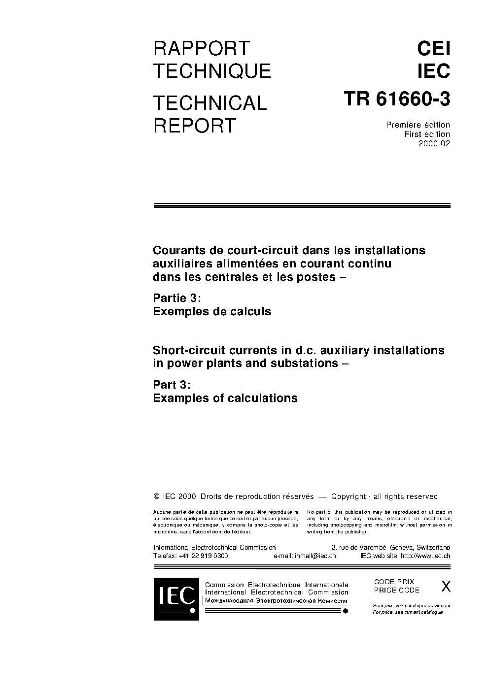 IEC TR 61660-3:2000 Short-circuit currents in d.c. auxiliary installations in power plants and substations - Part 3: Examples of calculations