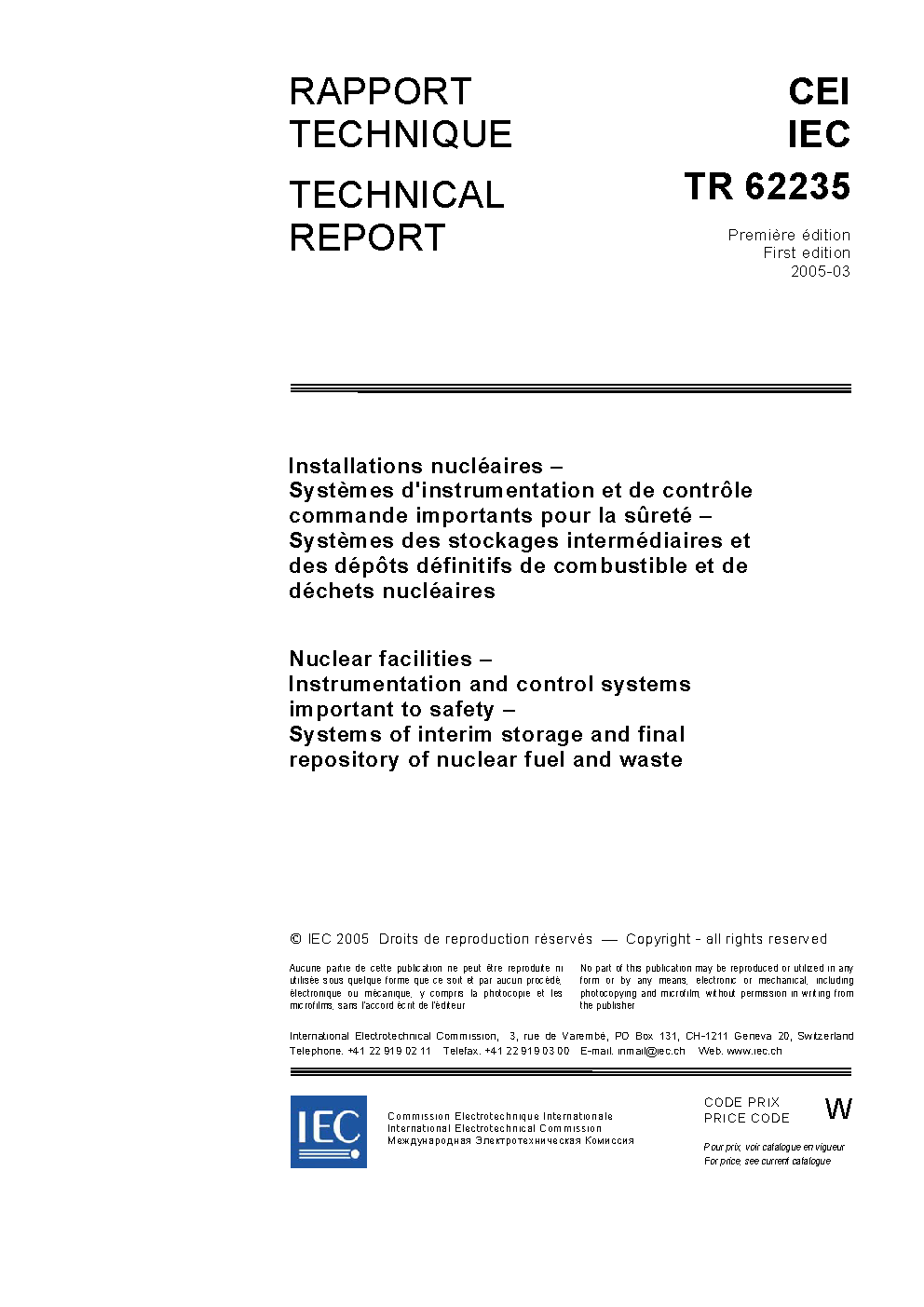 IEC TR 62235:2005 Nuclear facilities - Instrumentation and control systems important to safety - Systems of interim storage and final repository of nuclear fuel and waste