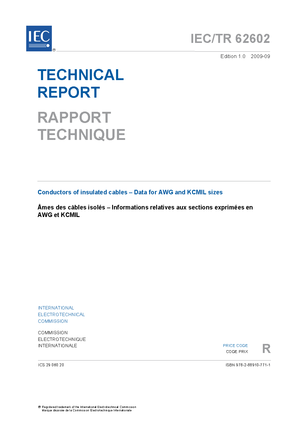 IEC/TR 62602:2009, which is a technical report, specifies the nominal cross-sectional areas, in the range 20 AWG to 2 000 kcmil (0,52 mm2 to 1 010 mm2), for conductors in electric power cables and cords for a wide range of types. Requirements for numbers and sizes of wires and resistance values are also included. These conductors include solid and stranded copper, aluminium and aluminium alloy conductors in cables for fixedinstallations and flexible copper conductors. This technical report is not intended to apply to conductors designed for use in cables intended for telecommunication or data transmission, winding wires or similar products. Unless indicated to the contrary in a particular clause, this technical report relates to conductors in finished cables and not to conductors made or supplied for inclusion into a cable. The annexes give supplementary information covering measurement of resistance (Annex A), temperature correction factors for resistance measurement (Annex B) and dimensional limits of circular conductors (Annex C).