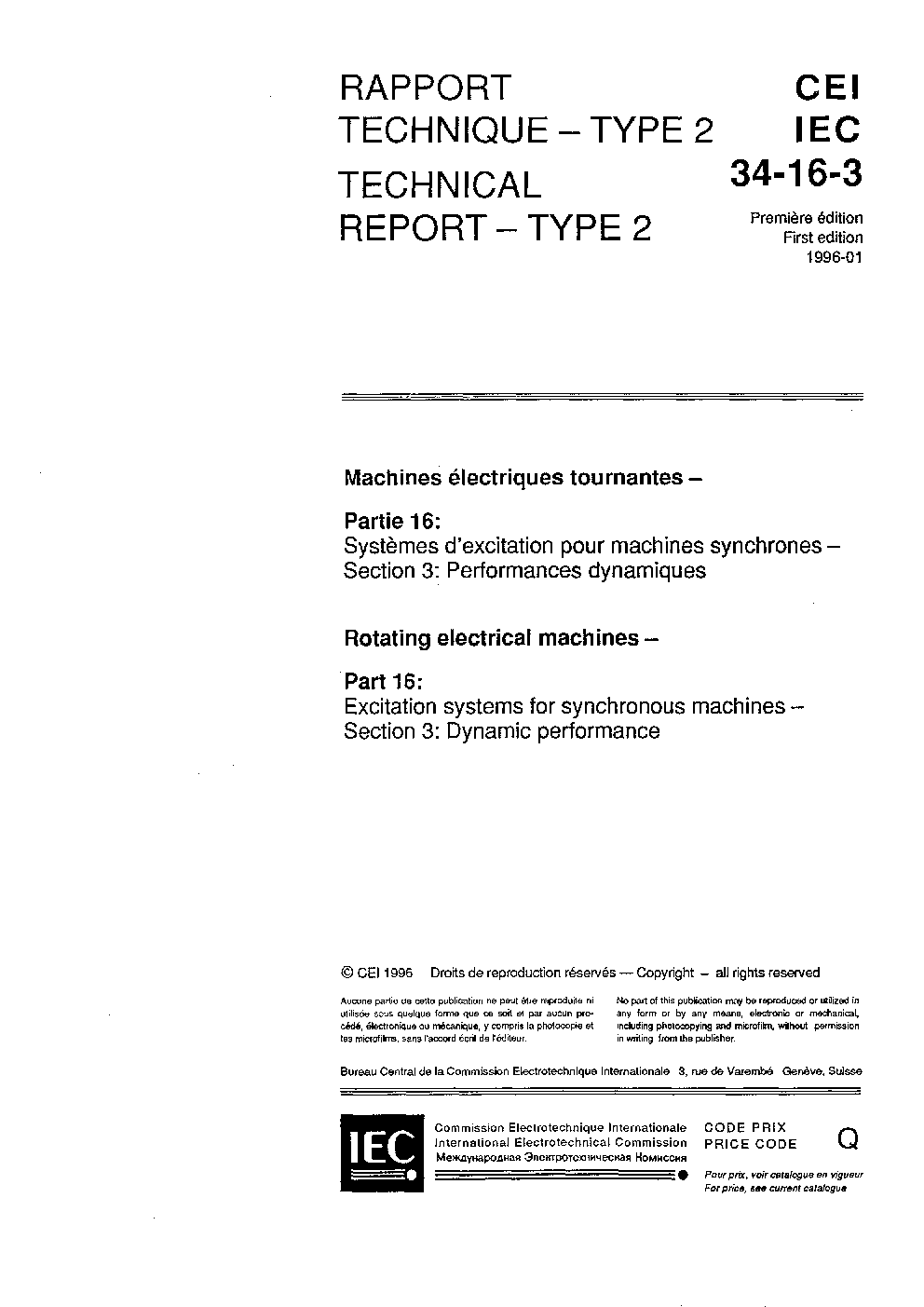 IEC TS 60034-16-3:1996 Rotating electrical machines - Part 16: Excitation systems for synchronous machines - Section 3: Dynamic performance