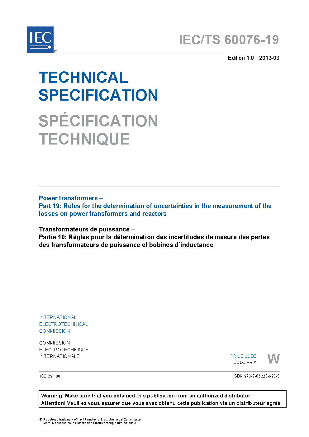 IEC TS 60076-19:2013 Power transformers - Part 19: Rules for the determination of uncertainties in the measurement of the losses on power transformers and reactors