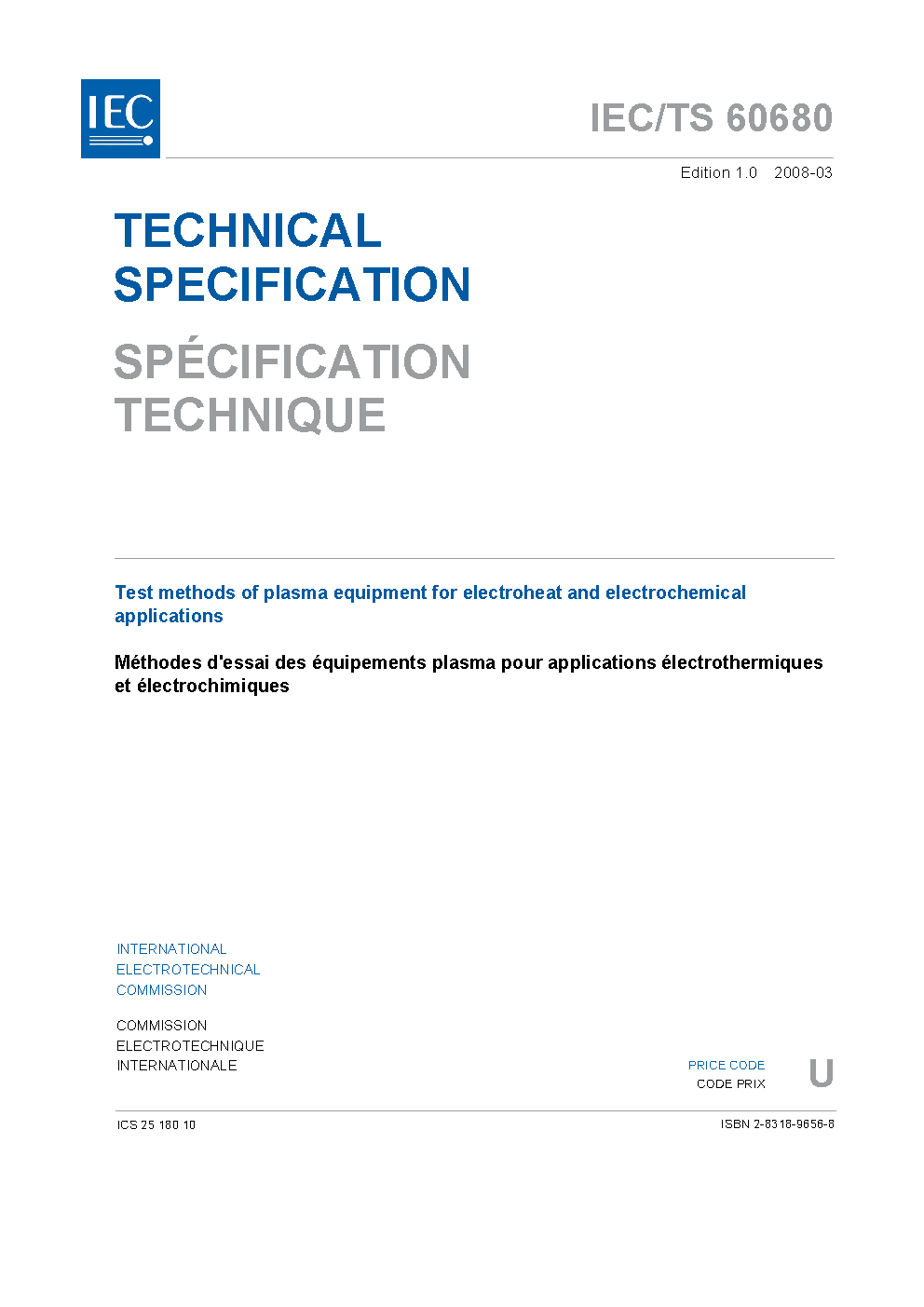 IEC/TS 60680 specifies test methods for thermal plasma torch systems and installations using thermal plasma torch systems. Standardizes the test methods and conditions for determining the main parameters and technical characteristics. Safety requirements for these systems and installations or equipment are given in IEC/TS 60519-5.