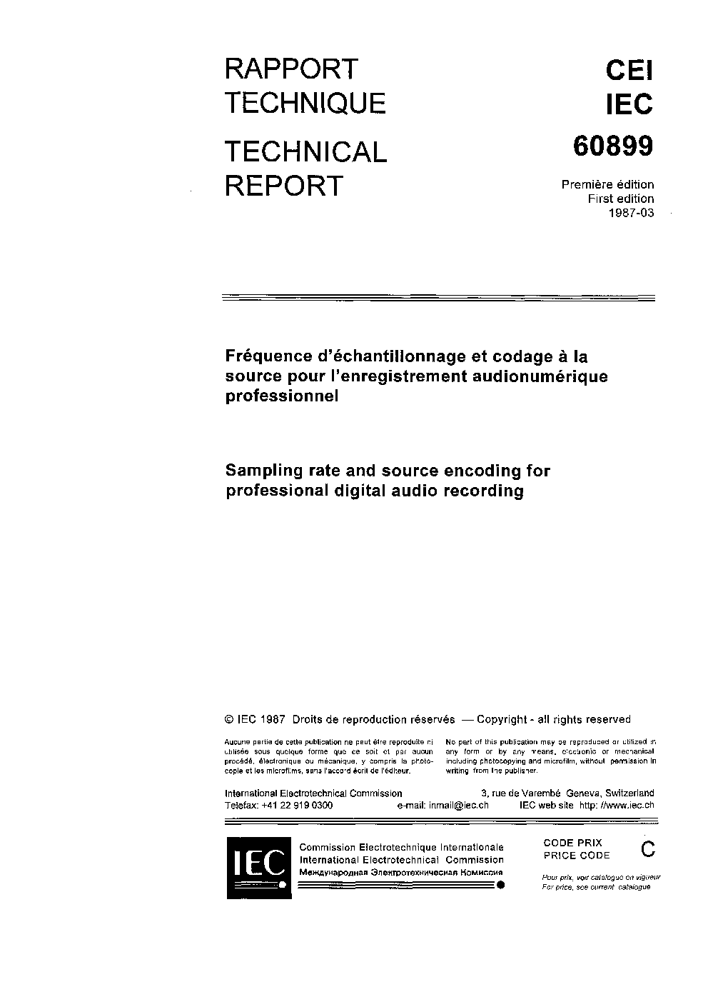 IEC TS 60899:1987 Sampling rate and source encoding for professional digital audio recording