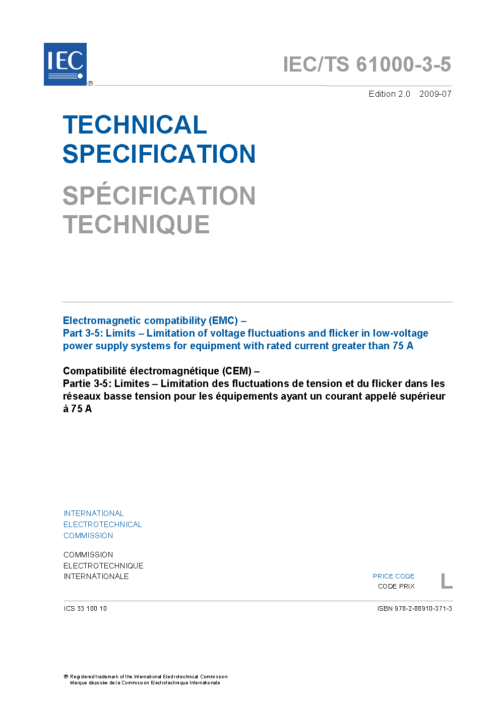 IEC TS 61000-3-5:2009 Electromagnetic compatibility (EMC) - Part 3-5: Limits - Limitation of voltage fluctuations and flicker in low-voltage power supply systems for equipment with rated current greater than 75 A