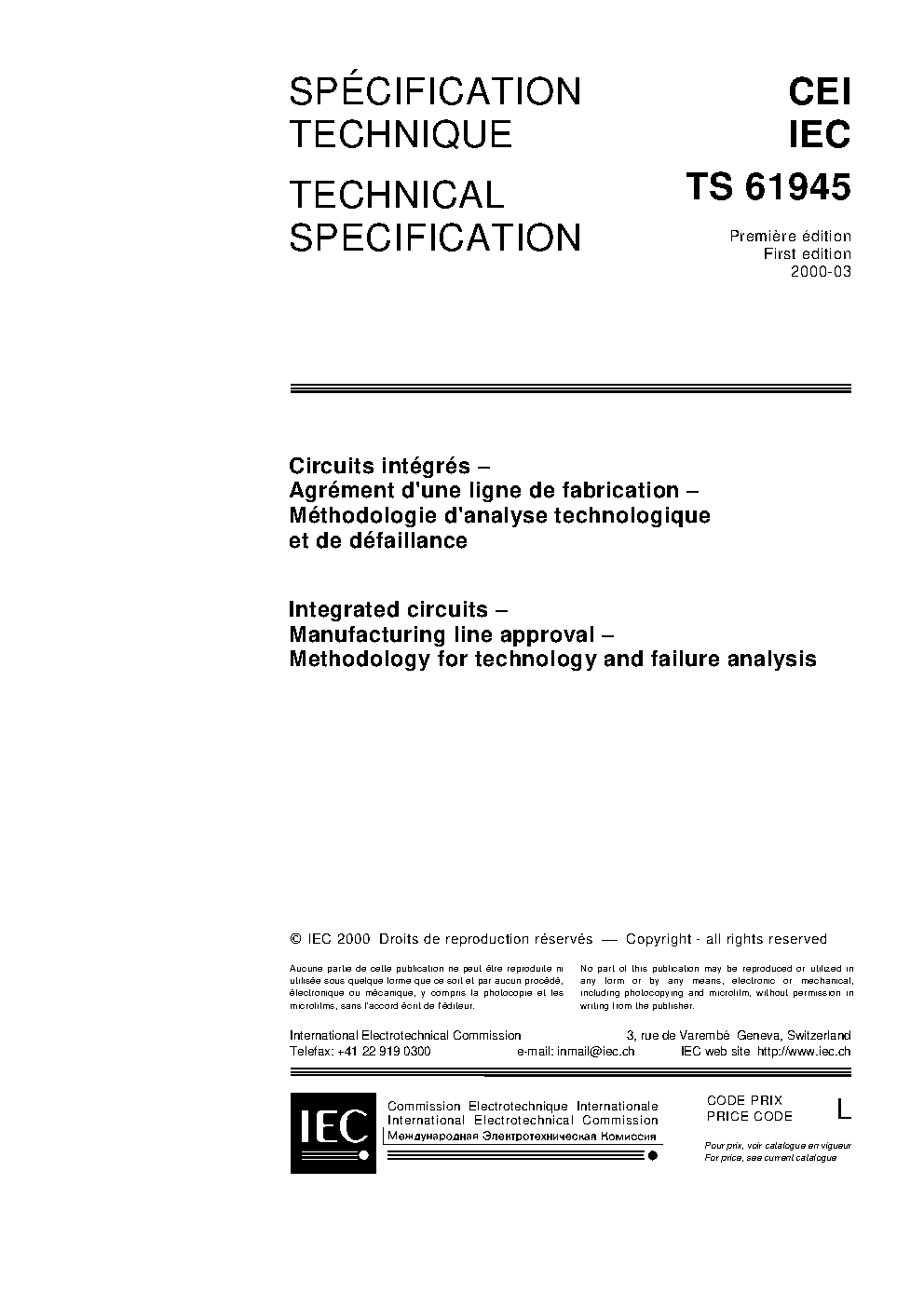 IEC TS 61945:2000 Interated circuits - Manufacturing line approval - Methodology for technology and failure analysis