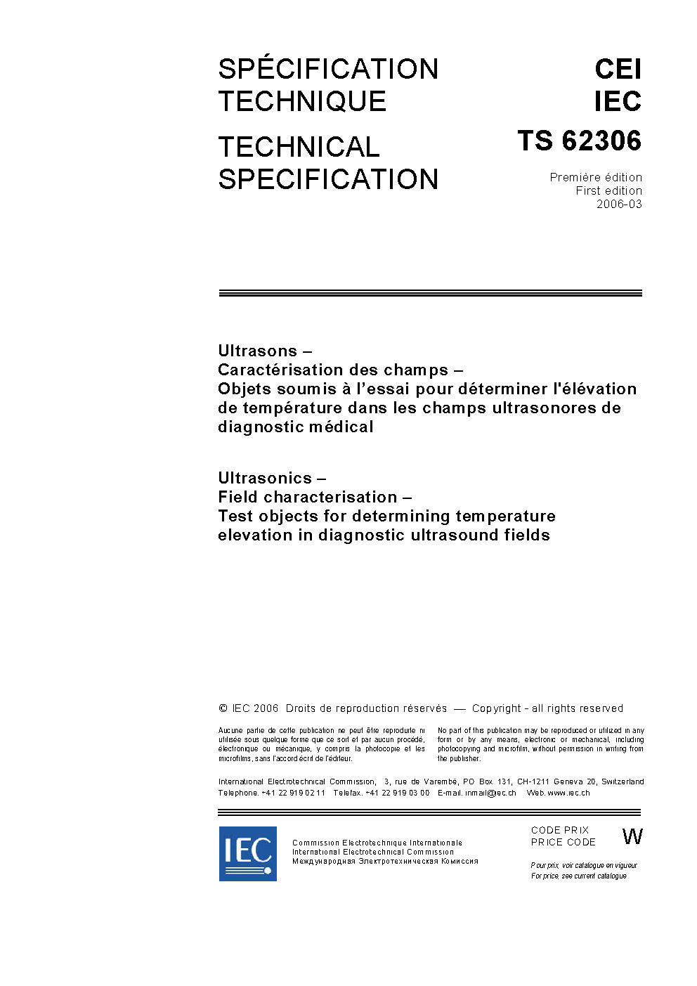 IEC TS 62306:2006 Ultrasonics - Field characterisation - Test objects for determining temperature elevation in diagnostic ultrasound fields