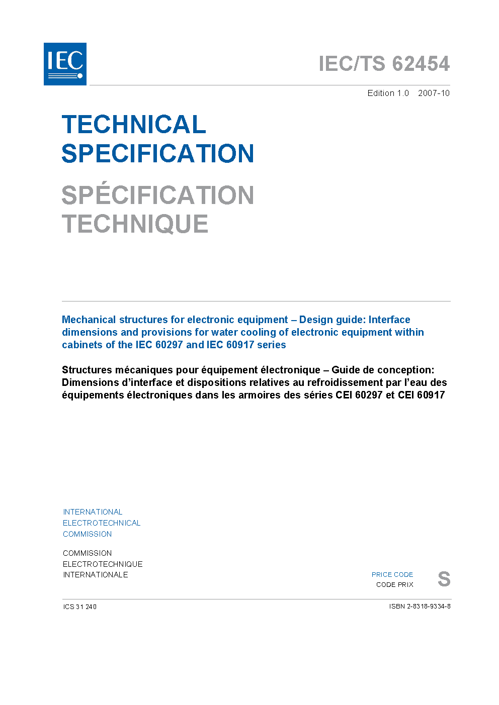 IEC TS 62454:2007 Mechanical structures for electronic equipment - Design guide: Interface dimensions and provisions for water cooling of electronic equipment within cabinets of the IEC 60297 and IEC 60917 series