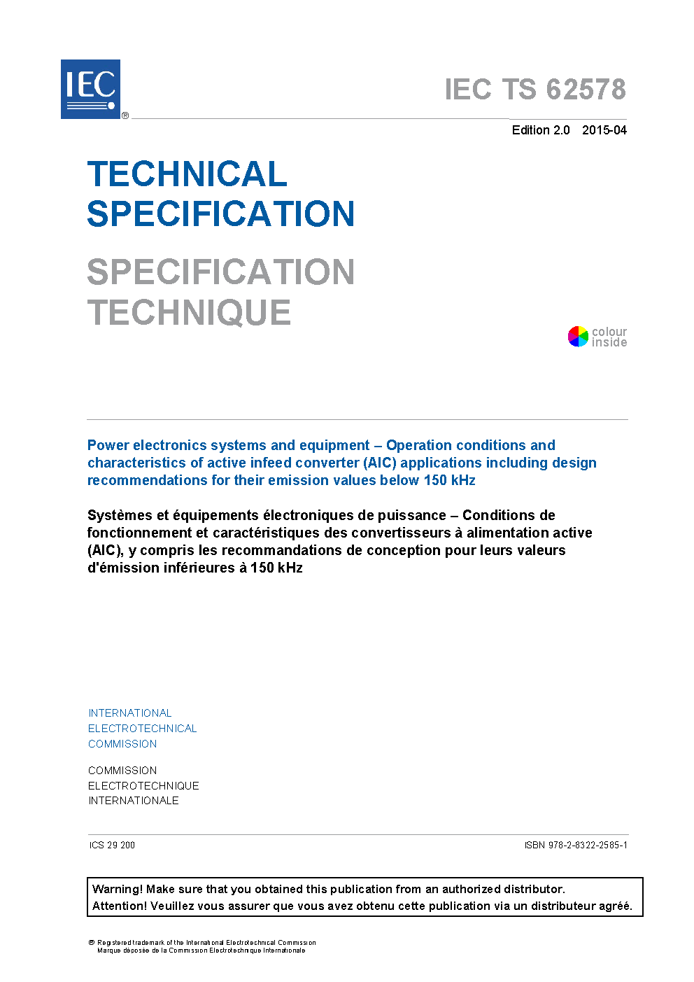 IEC TS 62578:2015 Power electronics systems and equipment - Operation conditions and characteristics of active infeed converter (AIC) applications including design recommendations for their emission values below 150 kHz