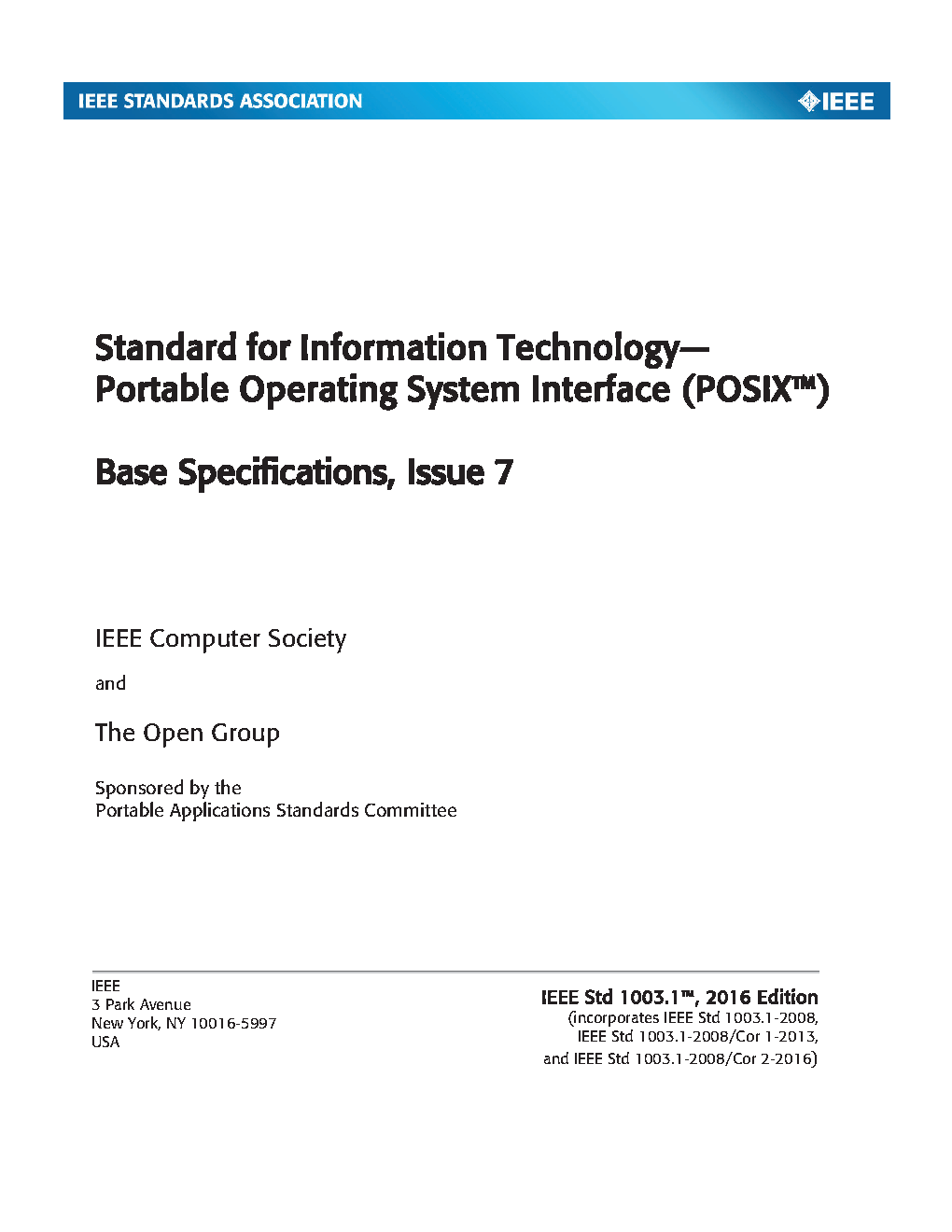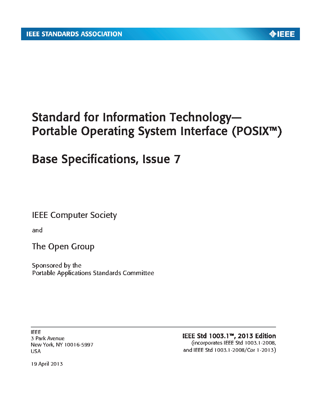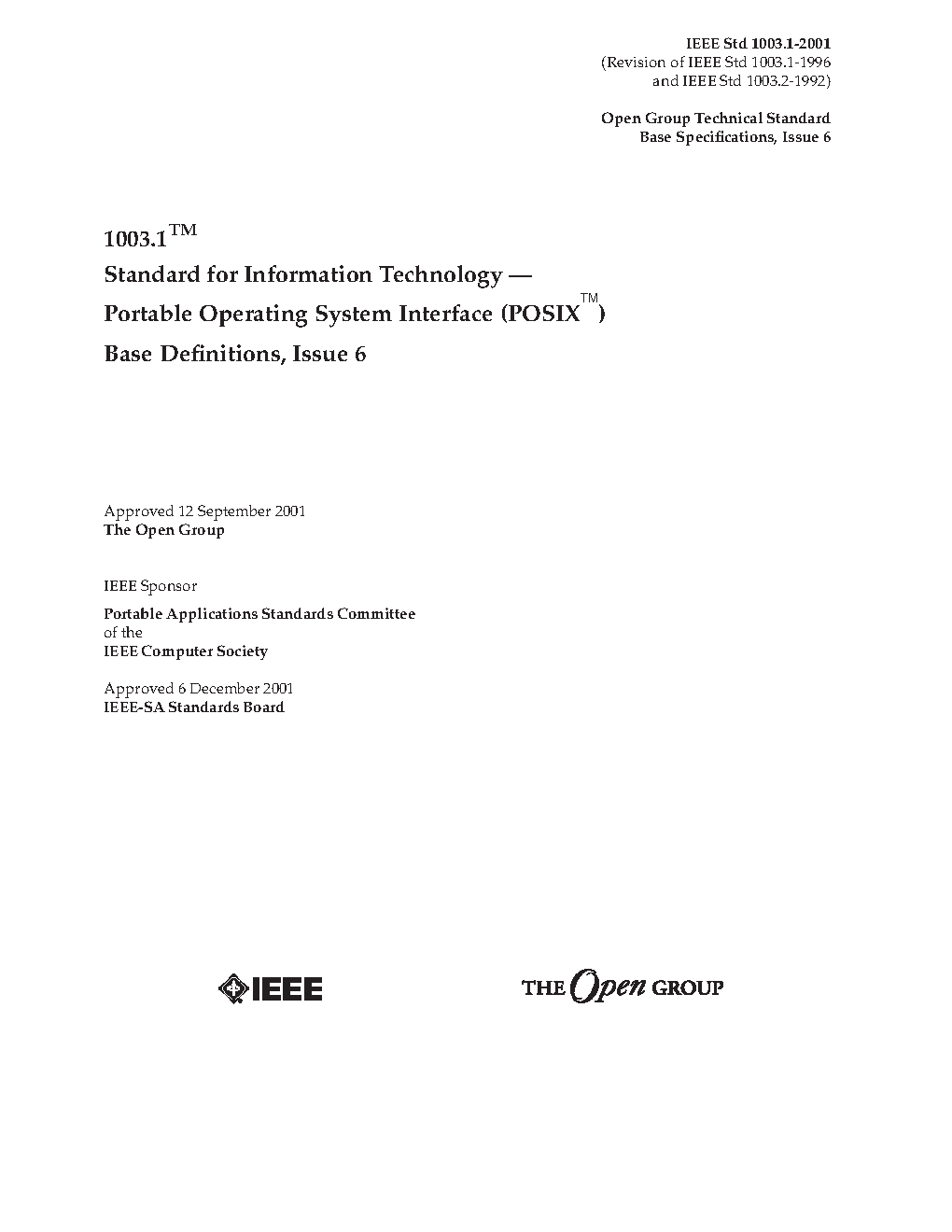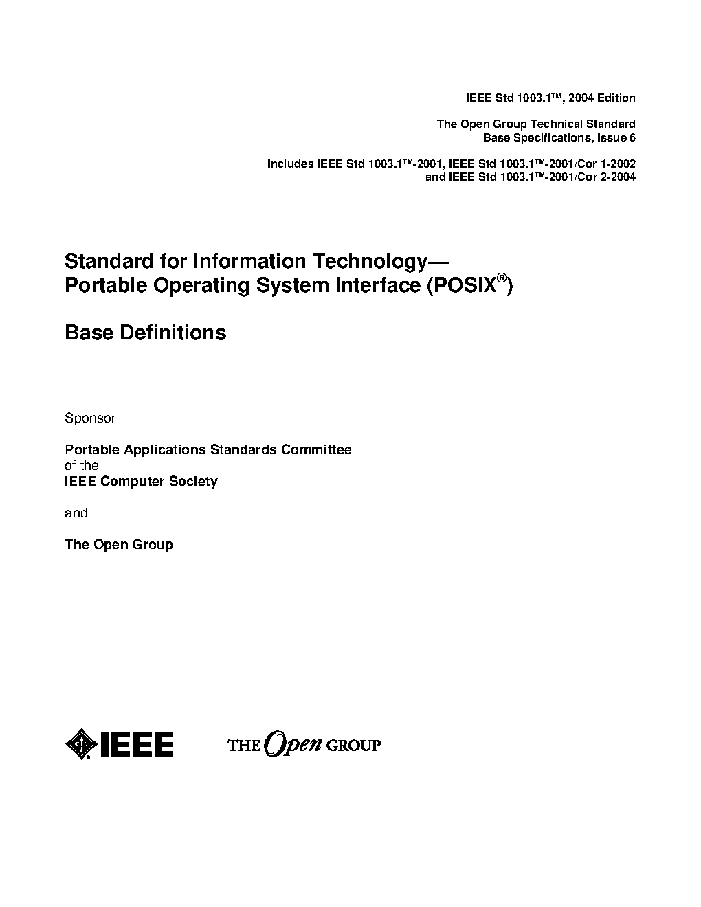This standard defines a standard operating system interface and environment, including a command interpreter (or "shell"), and common utility programs to support applications portability at the source code level. It is the single common revision to IEEE Std 1003.1-1996, IEEE Std 1003.2-1992, and the Base Specifications of The Open Group Single UNIX(TM)† Specification, Version 2. This standard is intended to be used by both applications developers and system implementors and comprises four major components