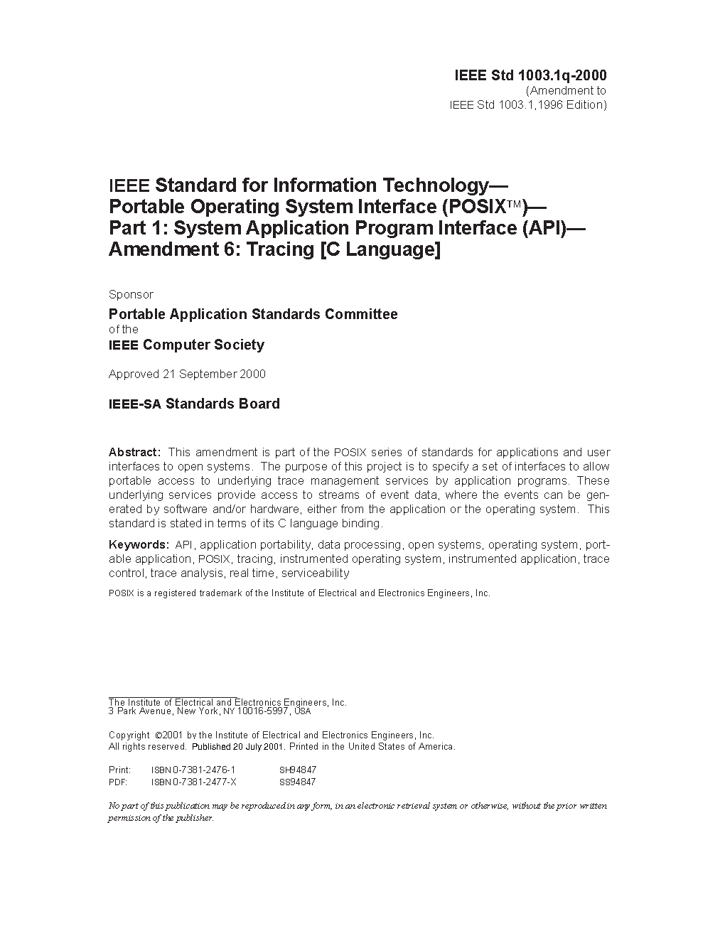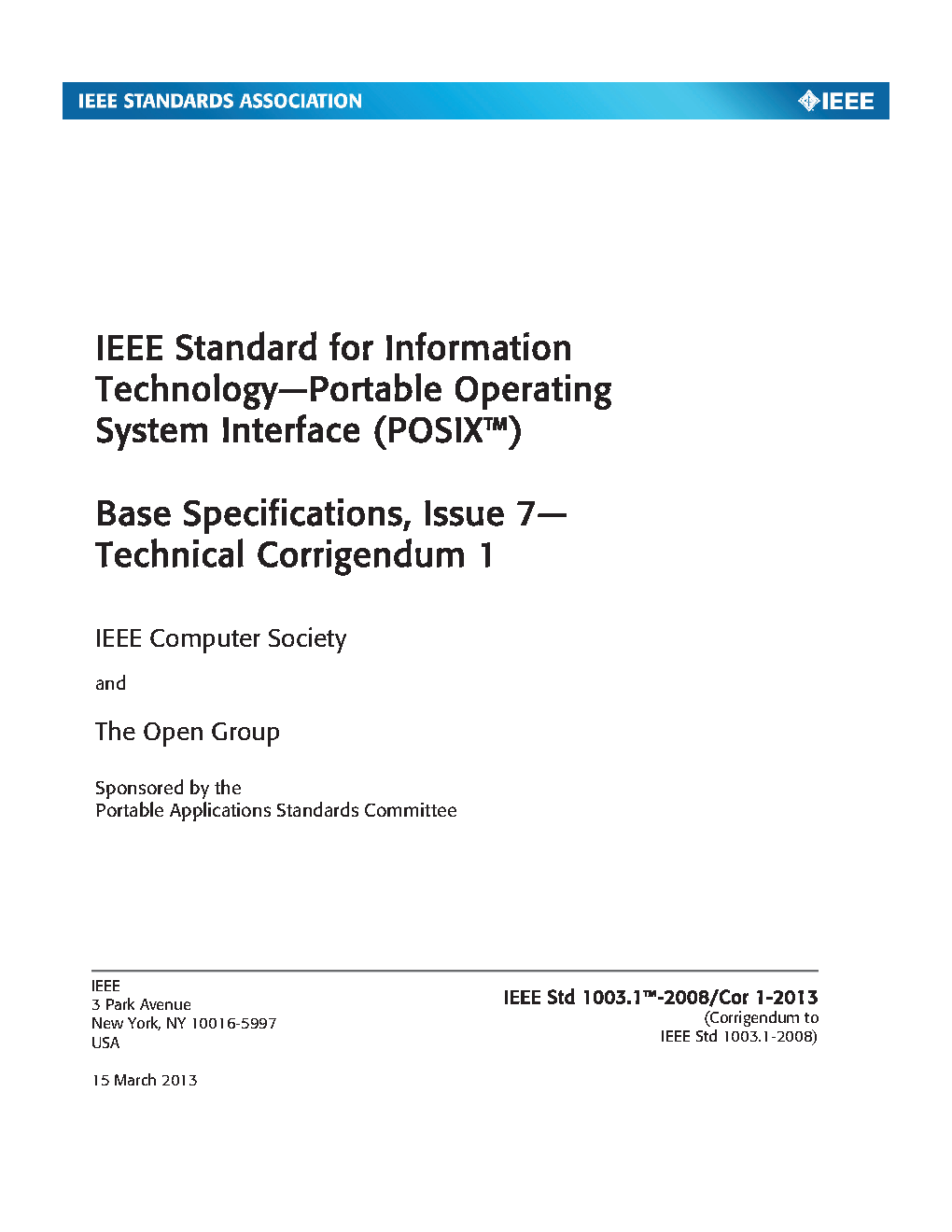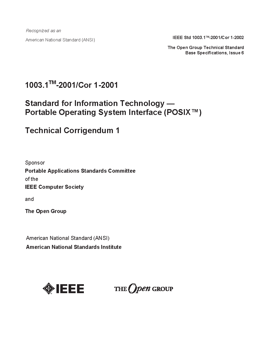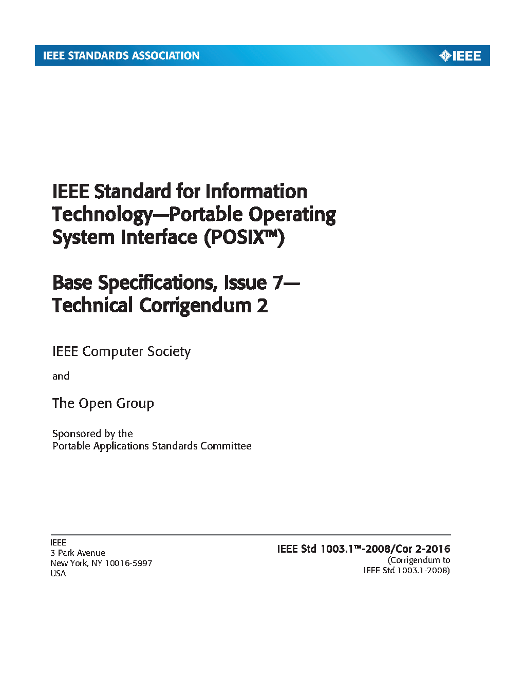This standard defines a standard operating system interface and environment, including a command interpreter (or "shell"), and common utility programs to support applications portability at the source code level. It is the single common revision to IEEE Std 1003.1-1996, IEEE Std 1003.2-1992, and the Base Specifications of The Open Group Single UNIX(TM)† Specification, Version 2. This standard is intended to be used by both applications developers and system implementors and comprises four major components