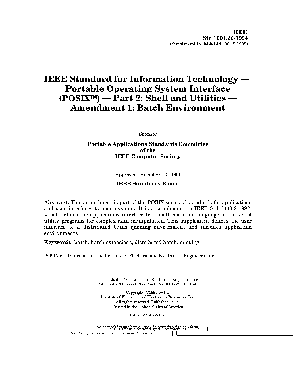 This amendment is part of the POSIX series of standards for applications and user interfaces to open systems. It is a supplement to IEEE Std 1003.2-1992, which defines the applications interface to a shell command language and a set of utility programs for complex data manipulation. This supplement defines the user interface to a distributed batch queuing environment and includes application environments.