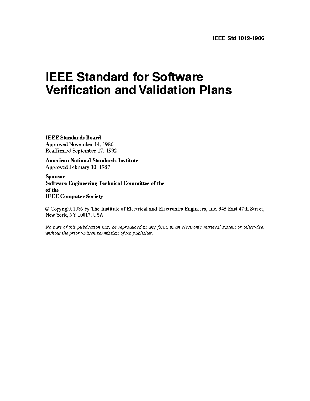 Verification and validation (V&V) processes are used to determine whether the development products of a given activity conform to the requirements of that activity and whether the product satisfies its intended use and user needs. V&V life cycle process requirements are specified for different integrity levels. The scope of V&V processes encompasses systems, software, and hardware, and it includes their interfaces. This standard applies to systems, software, and hardware being developed, maintained, or reused (legacy, commercial off-the-shelf [COTS], non-developmental items). The term software also includes firmware and microcode, and each of the terms system, software, and hardware includes documentation. V&V processes include the analysis, evaluation, review, inspection, assessment, and testing of products.