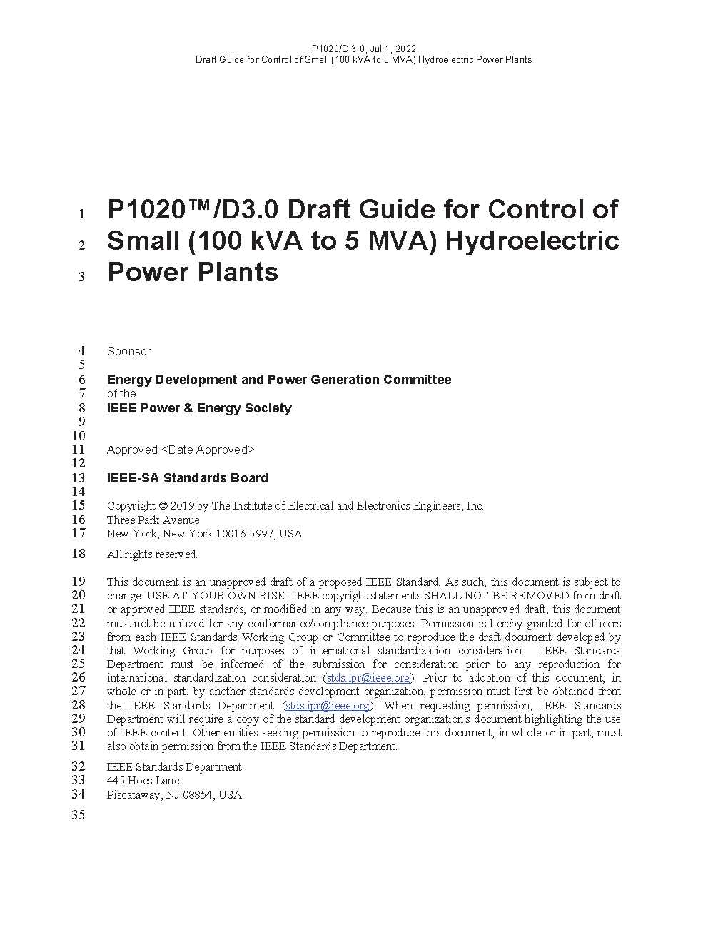 This guide describes the electrical control and monitoring requirements for equipment and systems associated with small (100 kVA to 5 MVA) hydroelectric power plants.